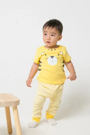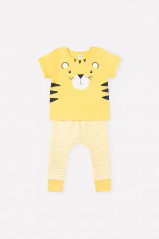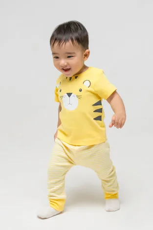 Описание: Комплект для мальчика из натурального хлопка. Жёлтая футболка с короткими рукавами украшена звериной мордочкой. Застёгивается на две кнопки в области плеча. Жёлтые брюки в полоску заканчиваются эластичными манжетами. Пояс на резинке.