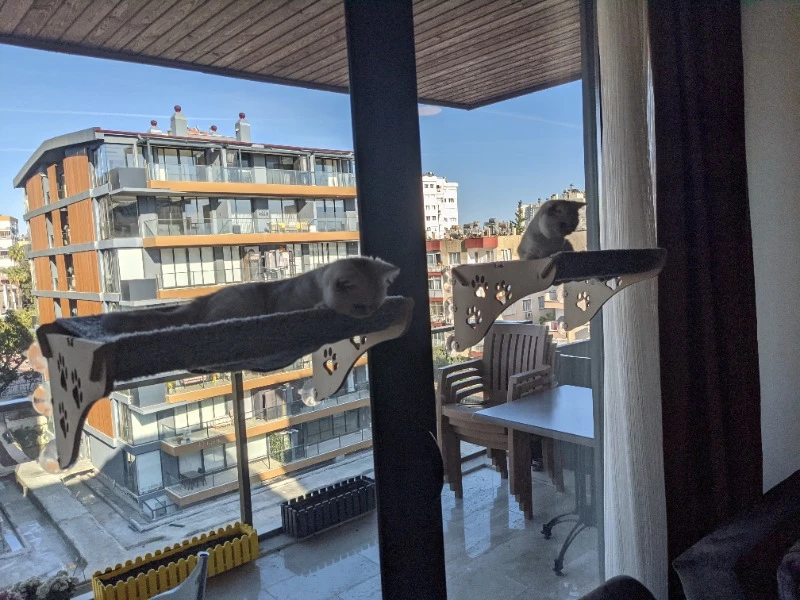 Esperaba que la madera fuera más gruesa y sólo hay una tela que une las dos maderas a modo de hamaca, pensaba que traería un poco de acolchado, pero no. Las ventosas no parecen muy fuertes pero yo lo voy a poner en la pared, no en la ventana, así que tengo que inventar alguna manera de poder agarrarlo. No se si las ventosas que trae (son 6) pueden aguantar el peso de un gato sobretodo si sube de un salto, yo le voy a meter por lo menos 3 tacos del 6 en cada lado.