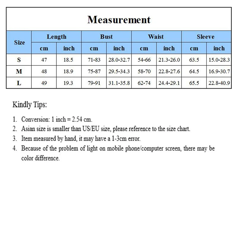 Размеры Длина, обхват груди, обхват талии, длина рукаваS: 47 см 71-83 см 54-66 см 63,5 смM: 48 см 75-87 см 58-70 см 64,5 смL: 49 см 79-91 см 62-74 см 65,5 см