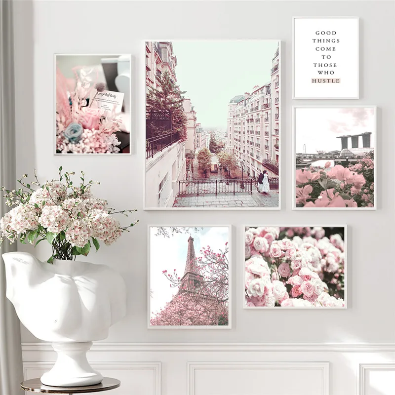 Настенный плакат с городским зданием, Современная Картина на холсте с изображением розового цветка, украшение для дома, Постер в скандинавском стиле для общежития