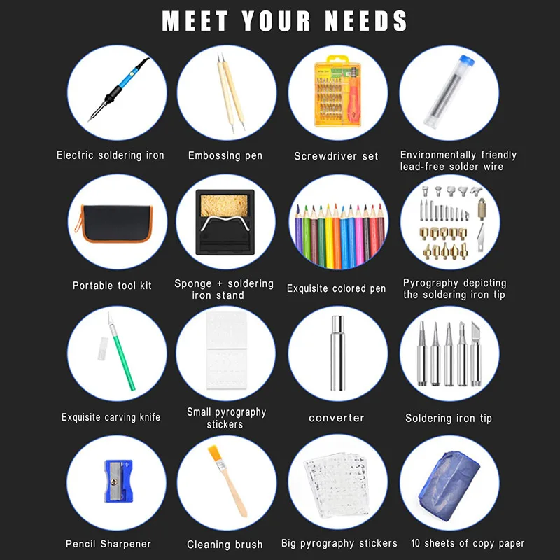 101 штук пирографа для резьбы по дереву 60 Вт с регулируемой температуройрезьбойтиснением железная ручка + шаблон + 12 цветных карандашей