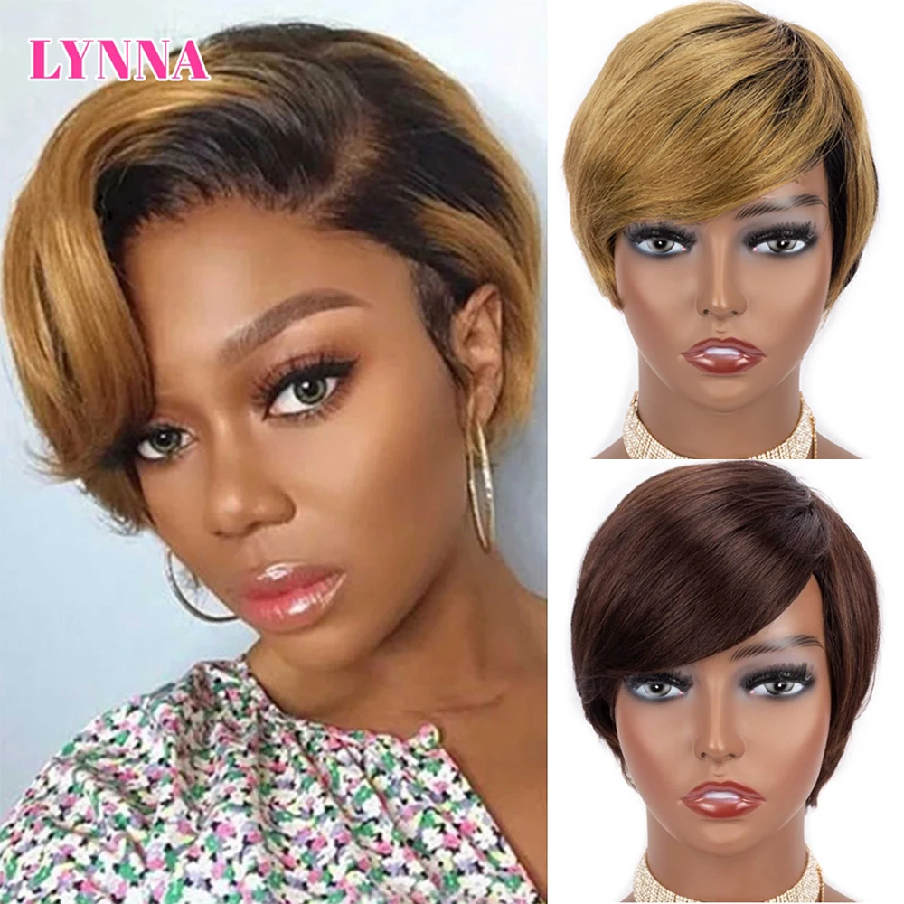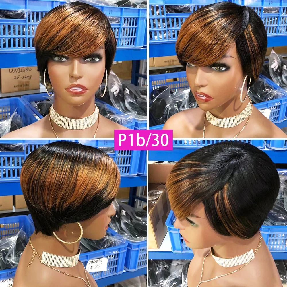 Парик с вырезом Пикси, человеческие волосы, прямые боб, Короткие парики с челкой, медовый блонд, Омбре, полностью машинный парик из человеческих волос для чернокожих женщин