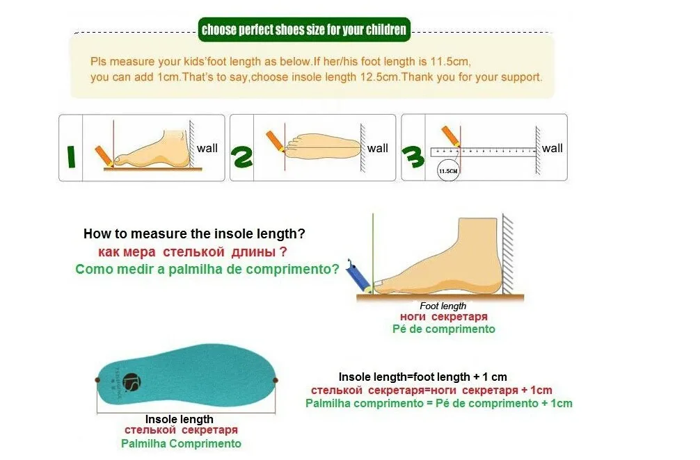 Когда вы заказываете детскую обувь,Вы должны соответствовать длине стельки. (длина стельки = длина стопы + 1 см)Американский размер не является стандартным, просто удобно для вас сделать заказ.Удобная длина стопы составляет около 1 см.