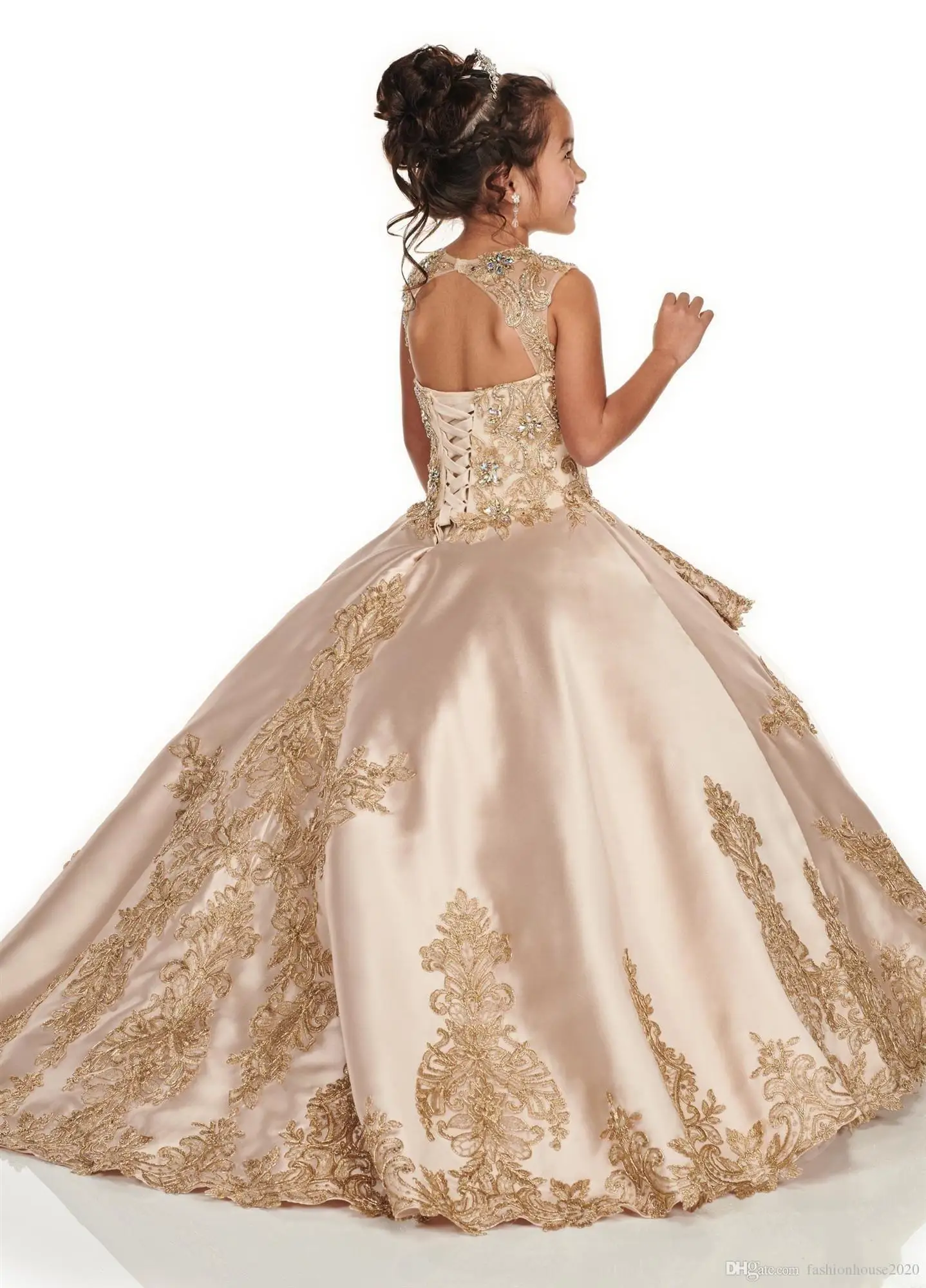 Платье для первого причастия, детское вечернее бальное платье с золотой аппликацией и бантом, нарядное платье для девочек, атласное Тюлевое платье с цветами для девочек