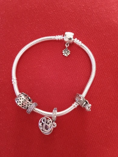 Очень красиво и деликатно, застежка немного трудно открыть и закрыть. Похоже, это серебро. Продавец посылает очарование в подарок
