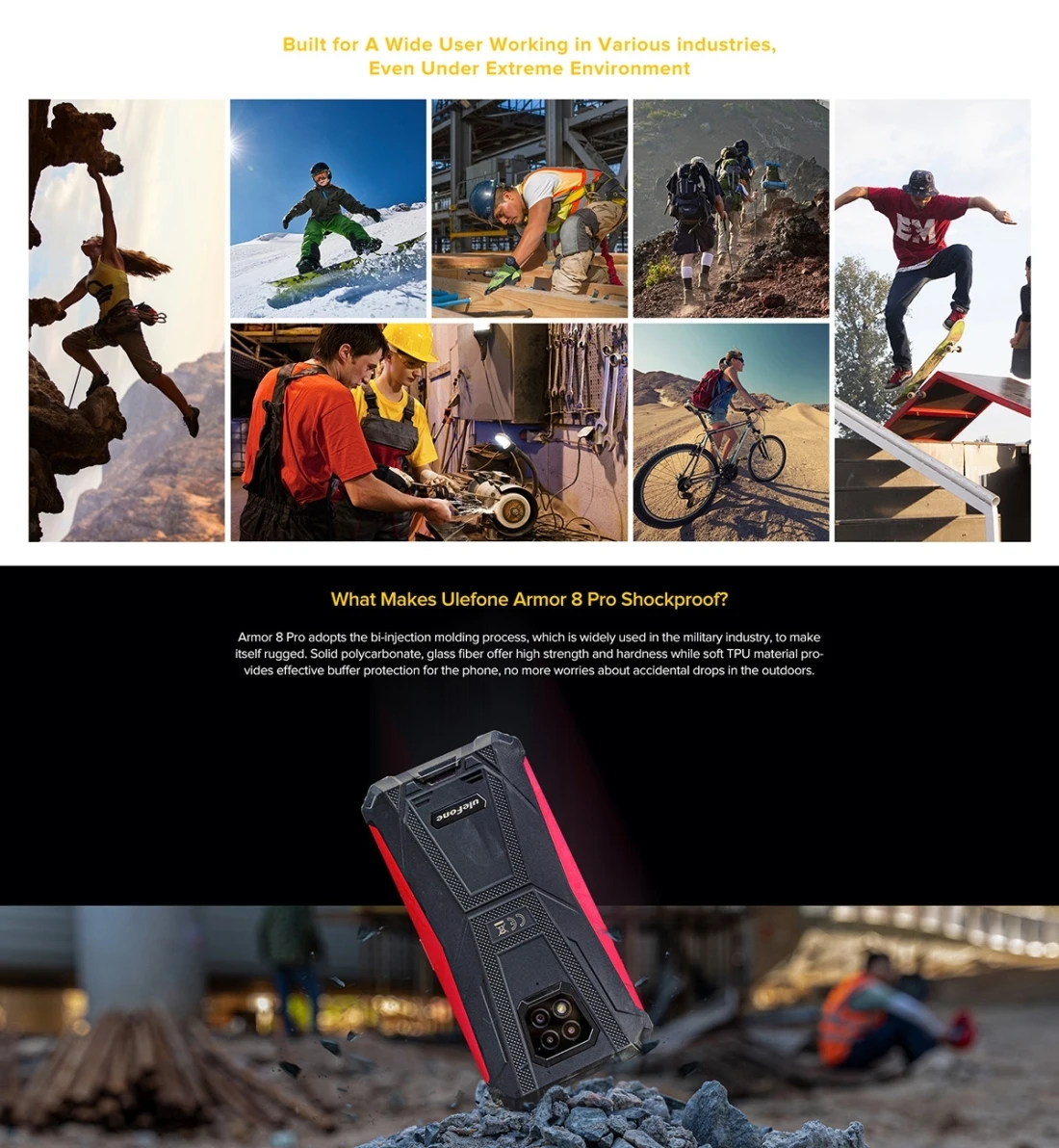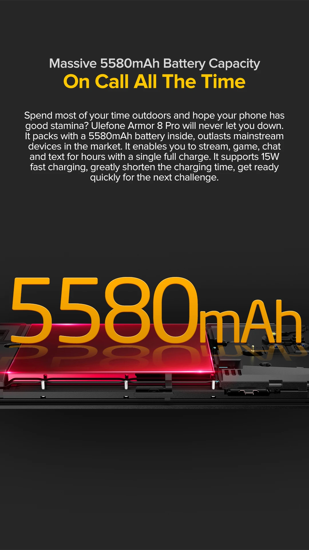 По вызову все времяПроводите большую часть своего времени на открытом воздухе и надеемся, что ваш телефон имеет хорошую выносливость? Ulefone Armor 8 Pro никогда не подведёт. Он оснащен аккумулятором емкостью 5580 мА · ч внутри, который превосходит основные устройства на рынке. Он позволяет передавать, играть, общаться и текст в течение нескольких часов с одной полной зарядкой. Он поддерживает быструю зарядку 15 Вт, значительно сокращает время зарядки, готовьтесь быстро к следующей задаче