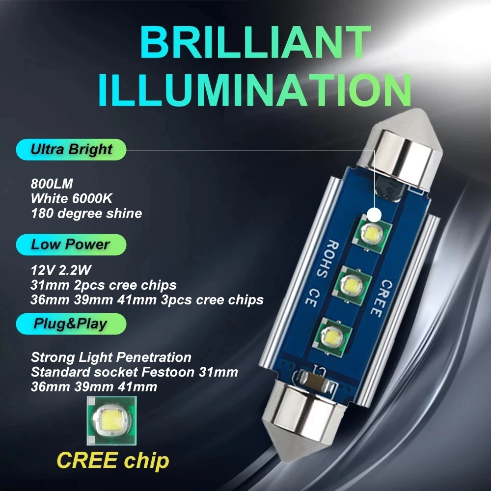 Разъем:Гирлянда 31 мм 36 мм 39 мм 41 ммОписание:Заявление для CANBUS:Есть ли у лампы canbus?Оснащен canbus: чип с canbus и стабильным током. (Подходит для автомобилей canbus 95% типов!)Напряжение: 12 В постоянного токаТок: 0,16 АМощность: 2 ВтЛюмен: 800 лмКоличество светодиодов: 3 чипаЦвет: белыйПрименение: автомобиль, мотоцикл, грузовик, внедорожник, квадроцикл и т. д.Теория теплоотдачи: авиационный алюминий 6063Водонепроницаемость: IP67Использование:Светильник льники s, верхние светильники s, светильник перчаточного ящика, светильник для чтения s, подсветка багажника светильник s, светильник номерного знака s и т. д.Особенности:1. Высокая эффективность и низкое энергопотребление2. Экологически чистый и энергосберегающий3. Более быстрый отклик при включении/выключении и устойчивость к вибрации4. Длительный срок службы до 50000 часов5. С 2 светодиодами высокой яркости cr-ee, ярче, чем обычные лампы накаливания.Дизайн с углом луча 6,360 градусов освещает каждый угол.7. Простота установки, подключи и работай.Посылка: светодиодные лампы 1 шт 2 шт 10 штПримечание:1. Пожалуйста, убедитесь, светодиодный ные лампы с canbus подходят для большего количества автомобилей, чем светодиодный ные лампы без canbus! Но подходит не для всех автомобилей с canbus!)2. С источником питания постоянного тока 12 В можно определить, работает ли сама лампочка.3. Пожалуйста, проверьте вашу розетку перед оформлением заказа. Спасибо.