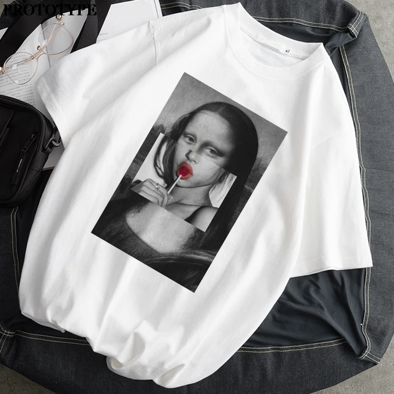 Летняя Новинка 2021, женская футболка с принтом Monla Lisa, Повседневная Женская Базовая футболка с круглым вырезом и коротким рукавом, Прямая поставка для девушек