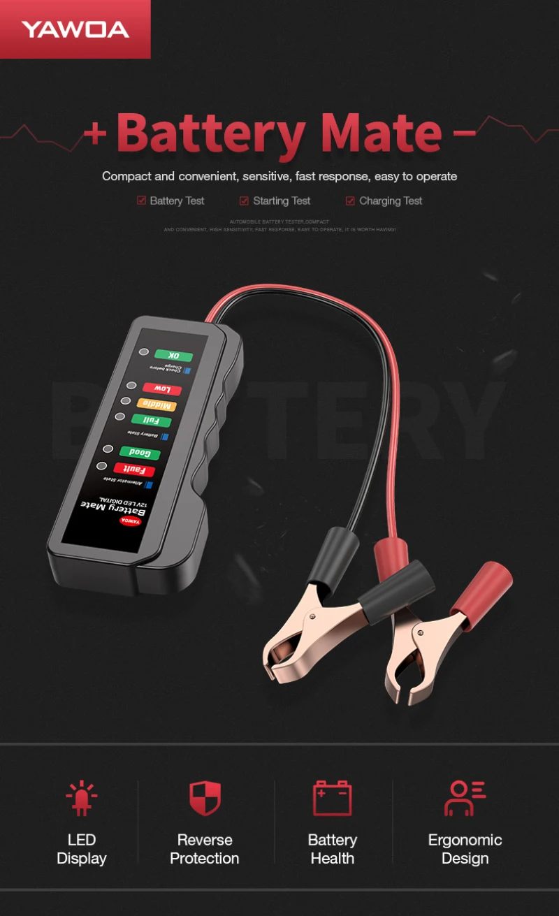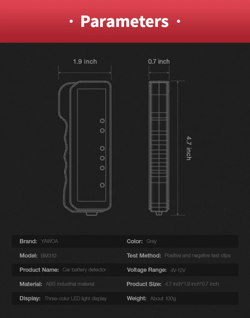 Размер тестера батареи: 12*5,2*1,8 см/4,7*2 * 0.7in