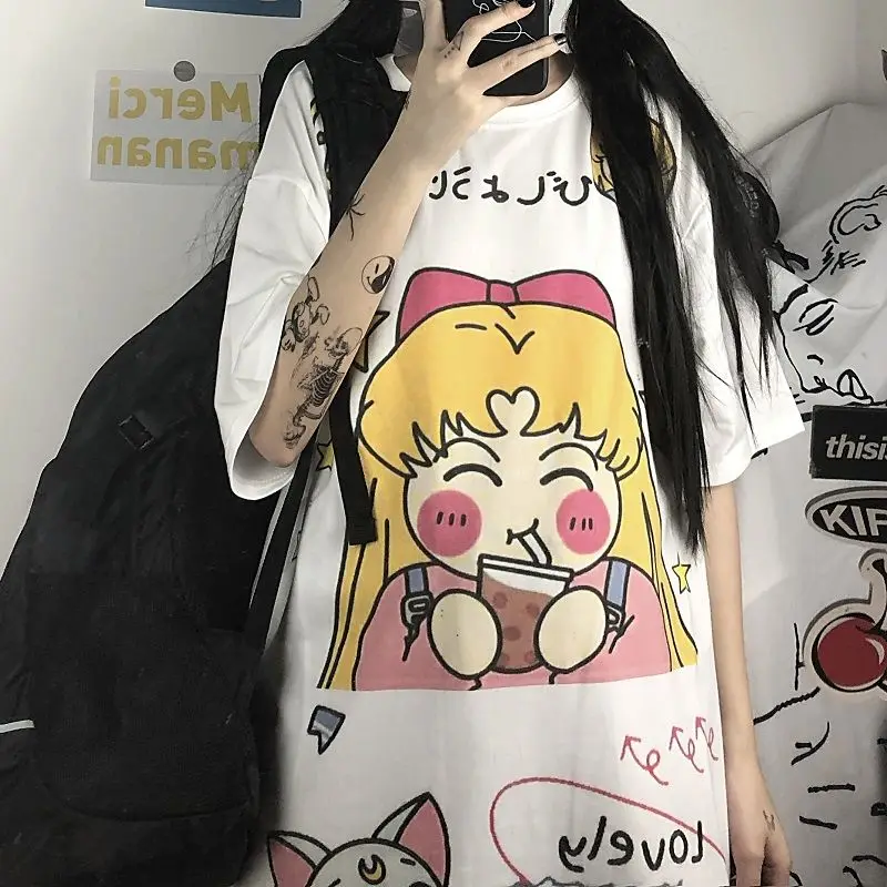 Летняя Новинка, Женская свободная универсальная рубашка в стиле Харадзюку С мультяшным принтом, футболка с коротким рукавом, футболки с графическим принтом, готические топы, женские футболки