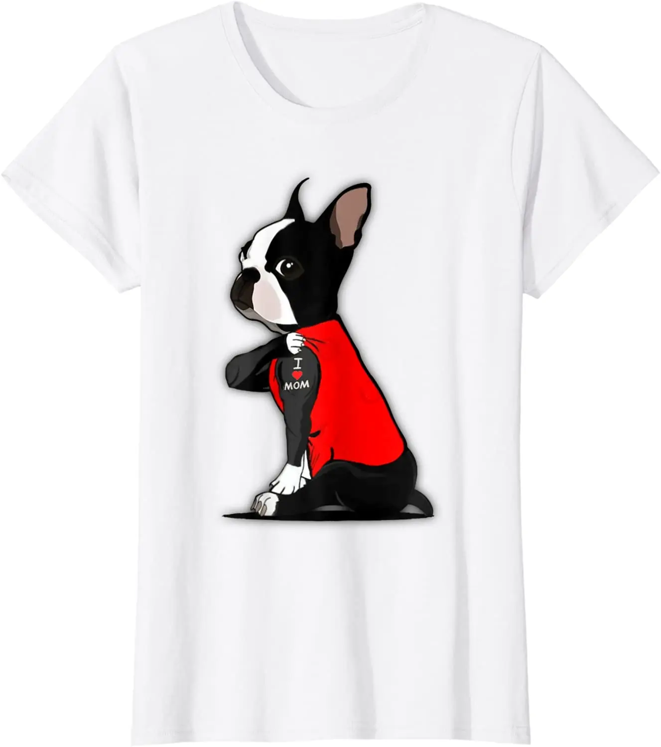 Бостон терьер татуировки I Love MOM сидящий подарок футболка