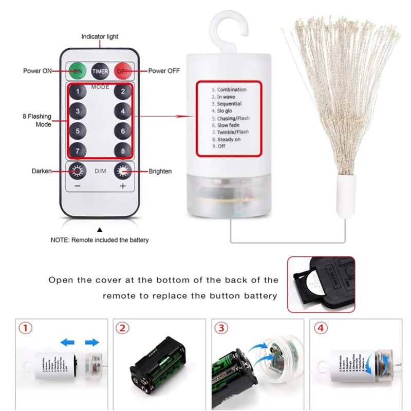 Источник питания: 4 * батарейки типа АА (струнный светильник)/батарейка с кнопкой CR2032 (пульт дистанционного управления)