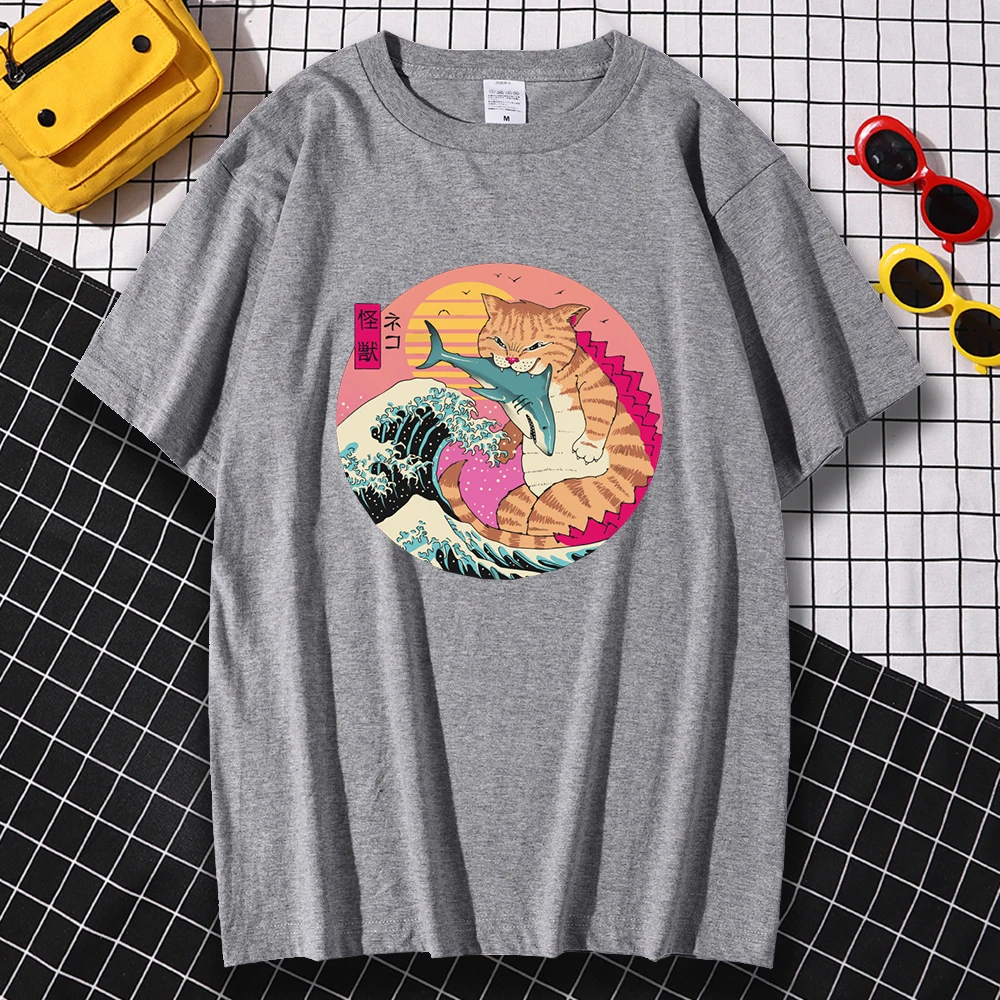 Футболки Ukiyoe с принтом японского кота и катаны, летние мужские свободные топы большого размера, винтажные повседневные футболки в стиле японского аниме Харадзюку