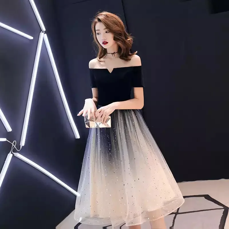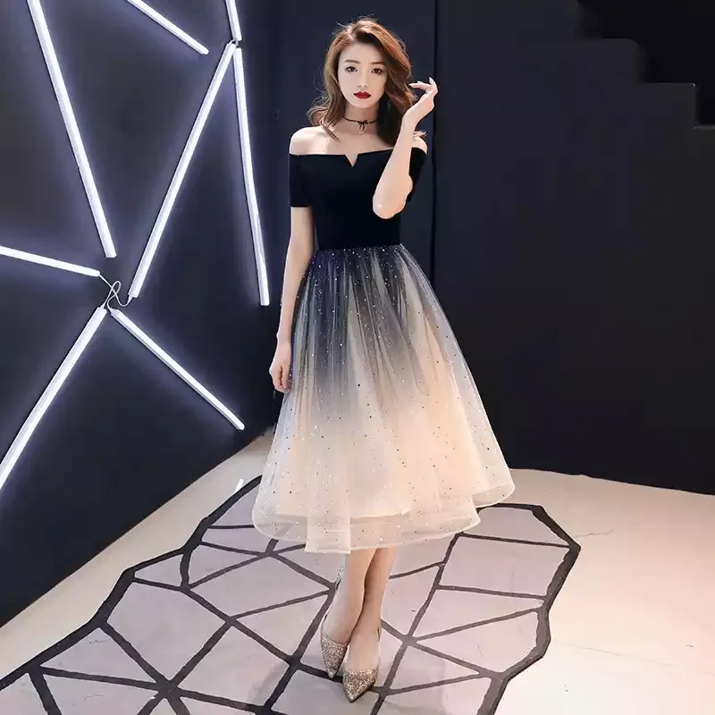 Банкетное вечернее платье, новинка 2021, модное платье с открытыми плечами и коротким рукавом, градиентное платье для выпусквечерние вечера, длиной ниже колена с блестками