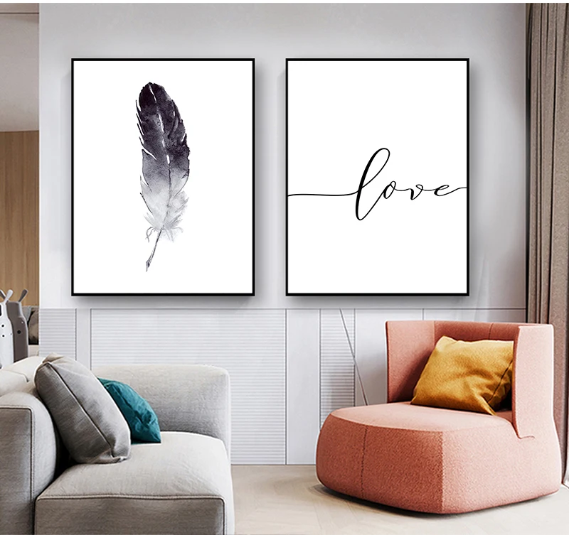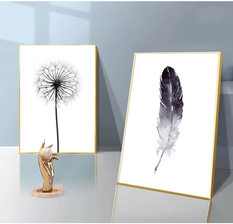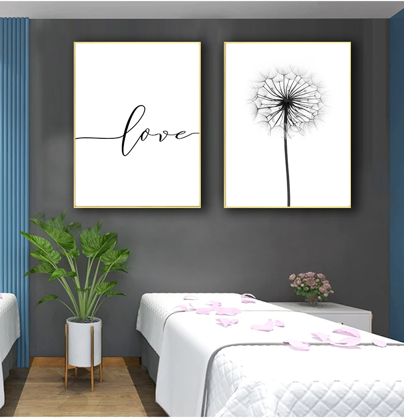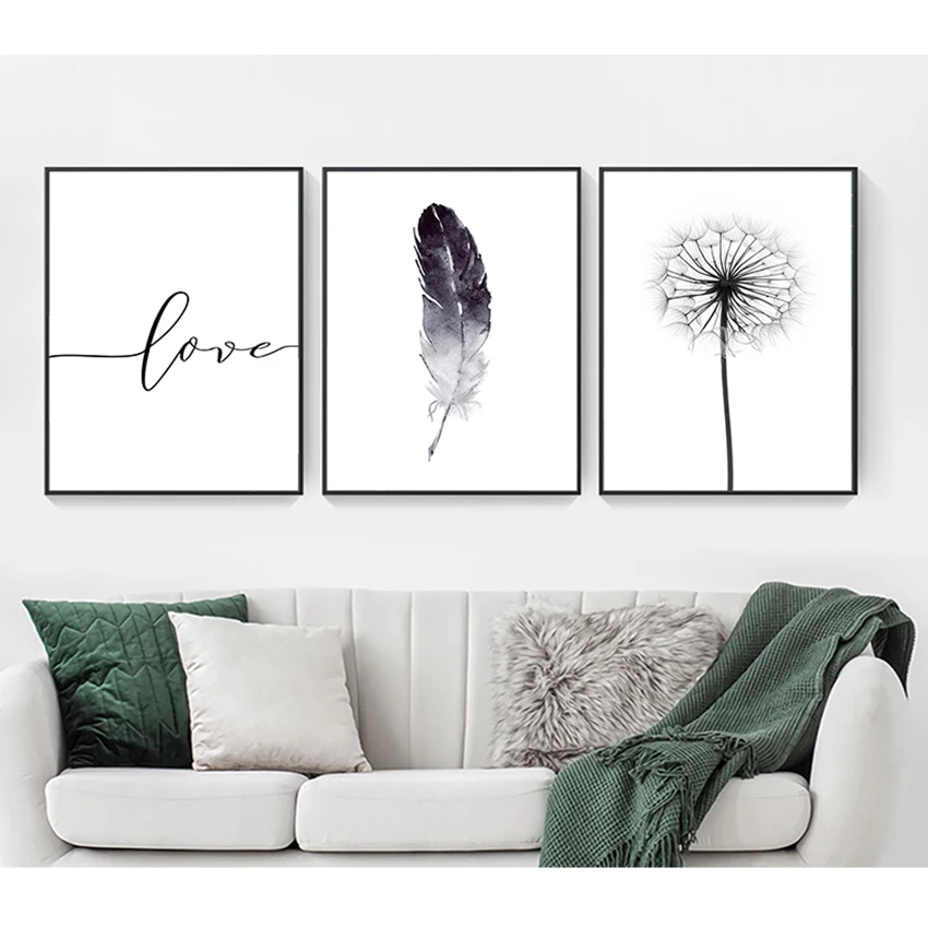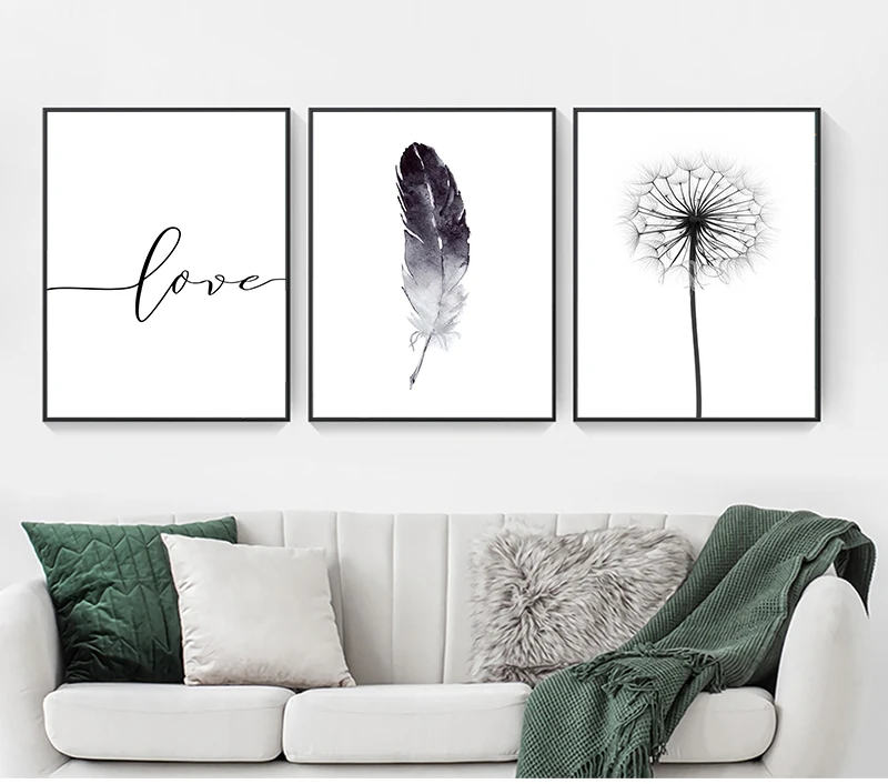 Домашняя картина, украшение для стен, черно-белый Одуванчик, перья и печать букв, любовь, Настенная Картина на холсте