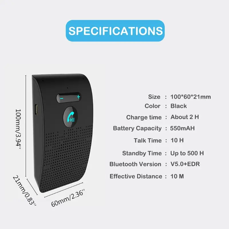 MXLF беспроводной автомобильный Bluetooth V5.0 Bluetooth Handsfree автомобильный комплект беспроводной Bluetooth динамик телефон солнцезащитный козырек клип динамик телефонOOTDTY100% новый и высокое качествоОсобенности:1. Bluetooth V5.0 + EDR, надежное и стабильное соединение для надежного вызова без рук2. Автоматическое включение/выключение3. Ответ/завершение/Отклонение вызова с помощью одного ключа4. Поддержка потоковой музыки/аудио от GPS приложений5. Встроенный DSP подавление шума и Функция подавления эха (CVC8.0)6. Оснащен динамиком Hi-Fi 2 Вт, более громким качеством звука7. Голосовое управление8. Поддерживает одновременное подключение двух мобильных телефонов9. До 500 часов в режиме ожидания, время разговора около 10 часов10. Голосовое Руководство: обеспечивает номер вызова, уровень заряда батареи, инструкцию сопряжения и состояние подключения BluetoothХарактеристики:Расстояние передачи Bluetooth: 10 мДинамик: 4Ω2W, стерео звук высокой четкостиРазмеры: Длина: 10 см (3.94in), ширина: 6 см (2.36in), высота: 2,1 см (0.83in)Цвет: черныйЯзык: английскийВремя зарядки: около 2 часовЕмкость аккумулятора: 550 мАчВремя вызова: около 10 часовВремя работы в режиме ожидания: до 500 часовВерсия Bluetooth: V5.0 + EDRКоличество: 1 комплектПримечание:1. Перевод ед. измерения: 1 см = 10 мм = 0,39 дюймов2. Допускается погрешность в 0-3 см из-за ручного измерения. Пожалуйста, убедитесь, что вы не возражаете, прежде чем сделать ставку.3. Из-за разницы между различными мониторами изображение может не отражать фактический цвет изделия. Спасибо!Посылка включает в себя:1 комплект громкой связи Bluetooth1 х USB кабель1 x зажим1 х Руководство