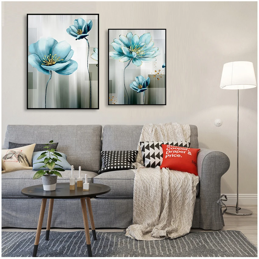 Настенная картина Голубой цветок для гостиной с золотым принтом