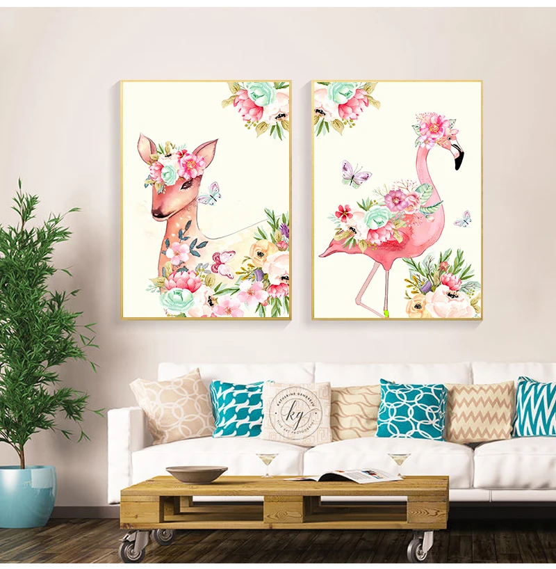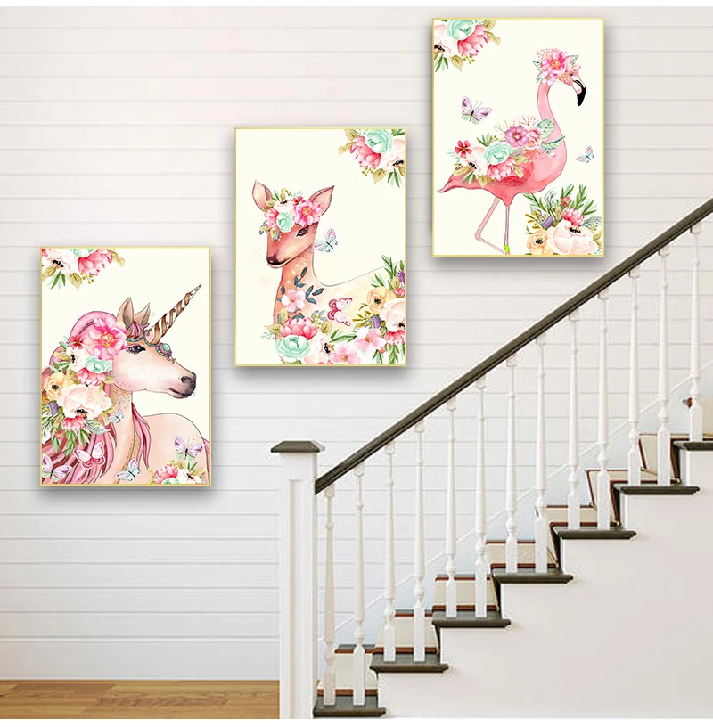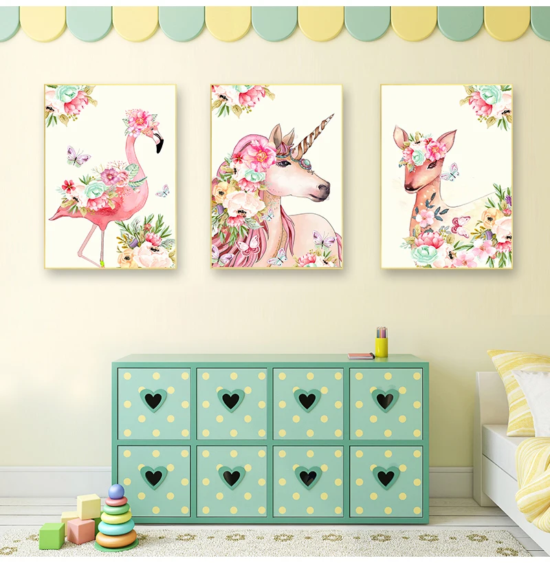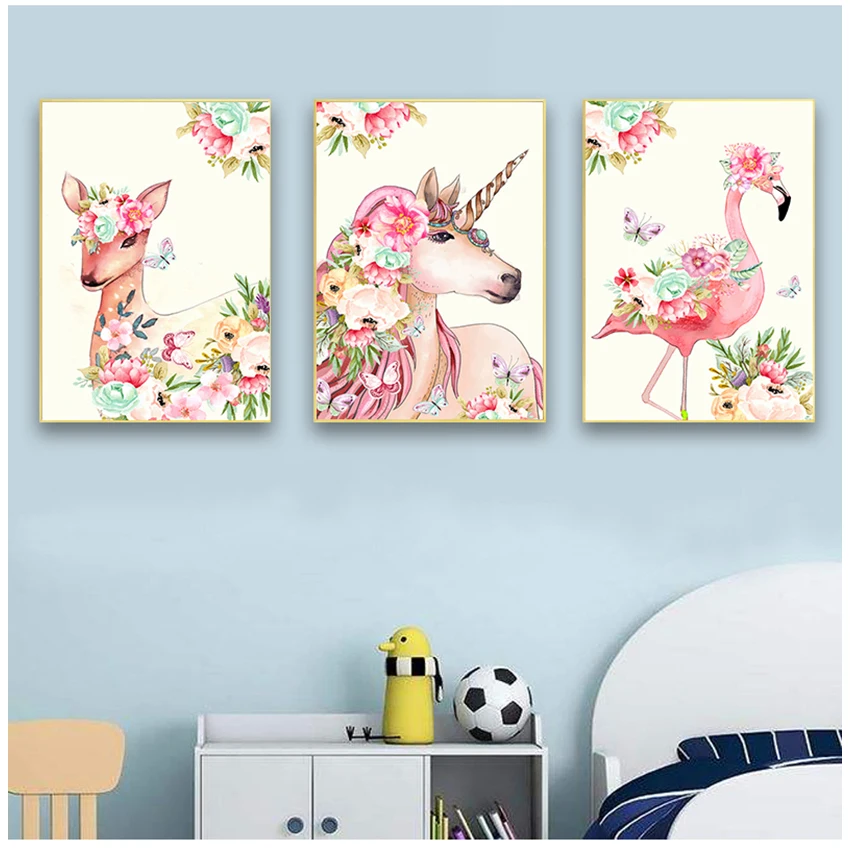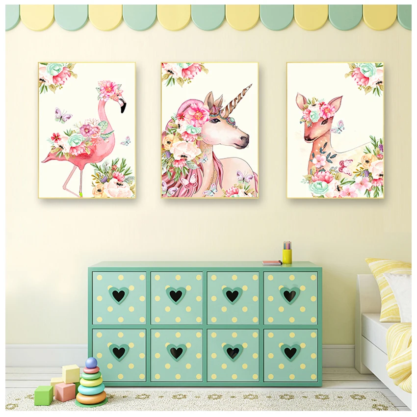 Декоративная картина в скандинавском стиле, украшение для детской спальни, цветок, единорог, фламинго, холст, постер, настенное искусство, искусство, Картина на холсте