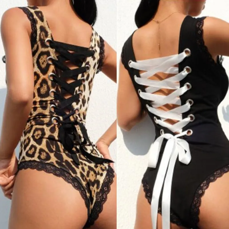 Женское сексуальное кружевное леопардовое облегающее Боди без рукавов, Женское боди на бретельках с завязкой сзади, Облегающий комбинезон, женские комбинезоны