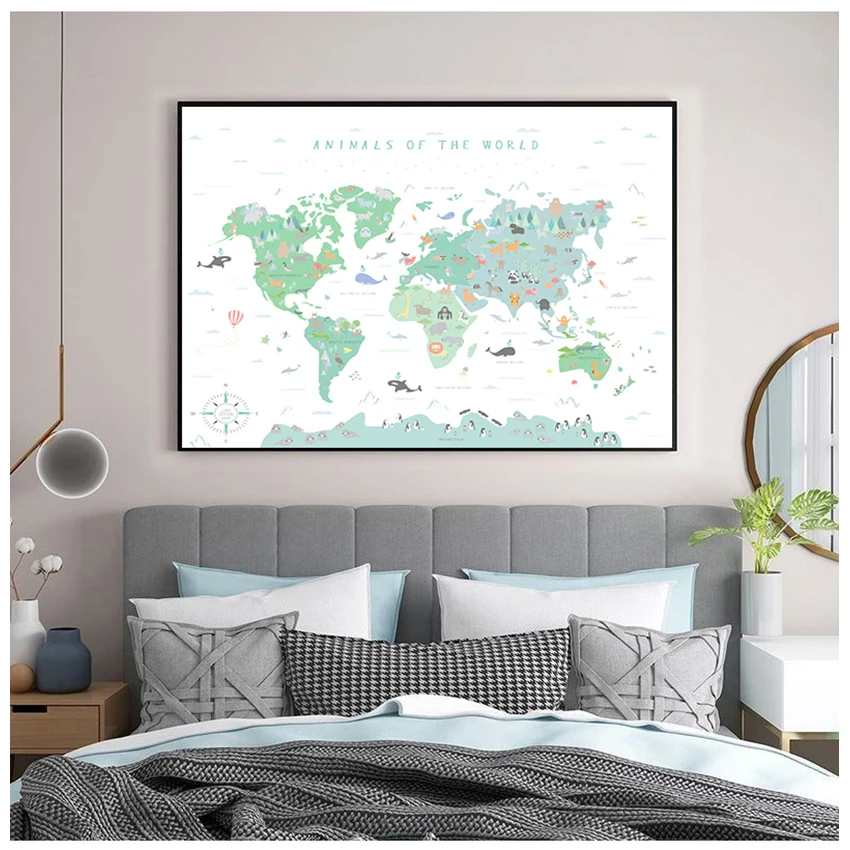 Искусство стен, животные из мультфильмов, декор детской комнаты, животные, иллюстрация, Карта мира, картина