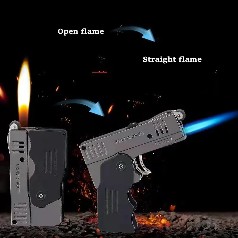 Креативный металлический пистолет с двойной деформацией пламени Бутановая газовая зажигалка струйный фонарь ветрозащитная кремневая забавная Зажигалка для сигар маленький подарок