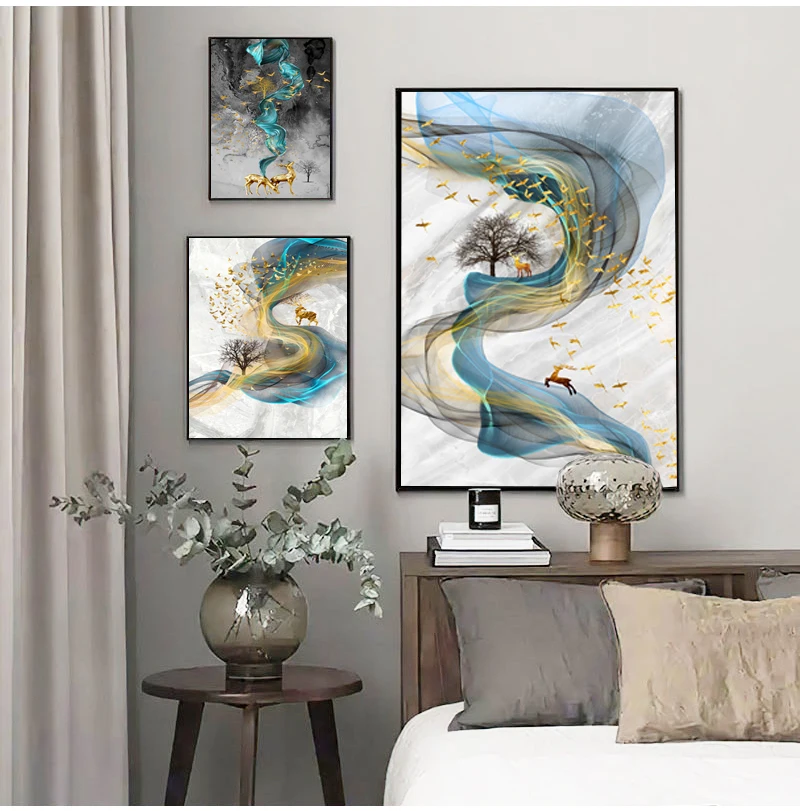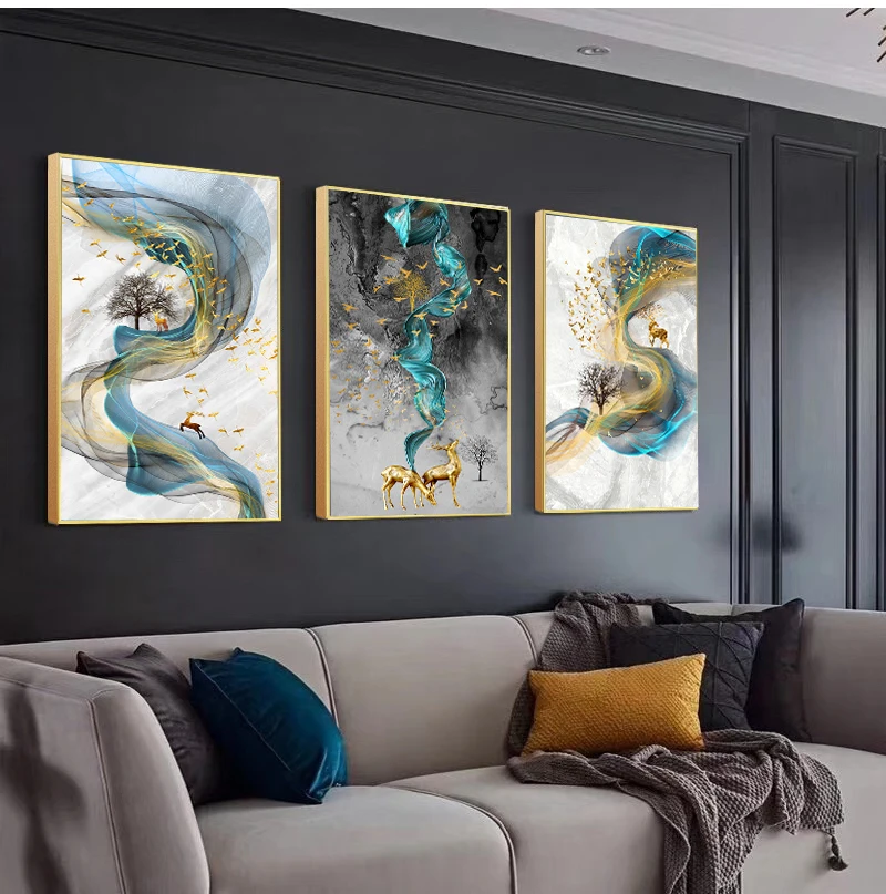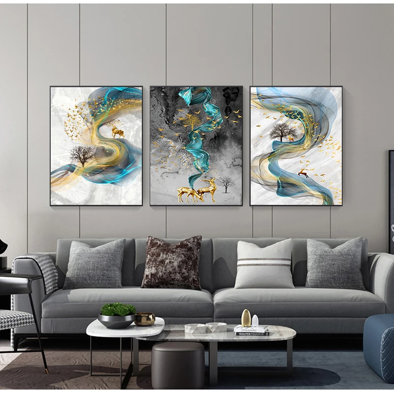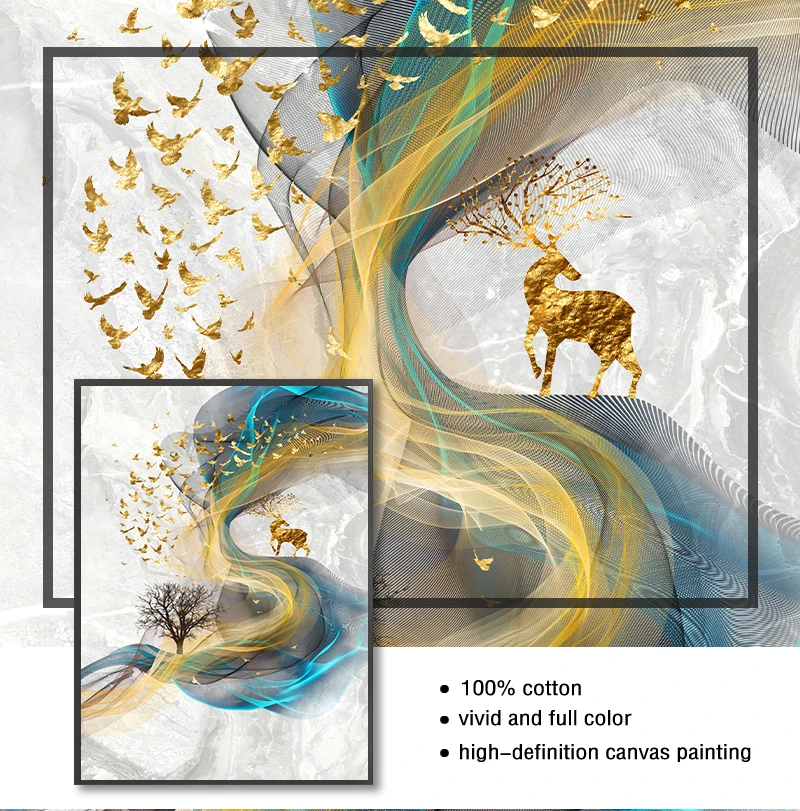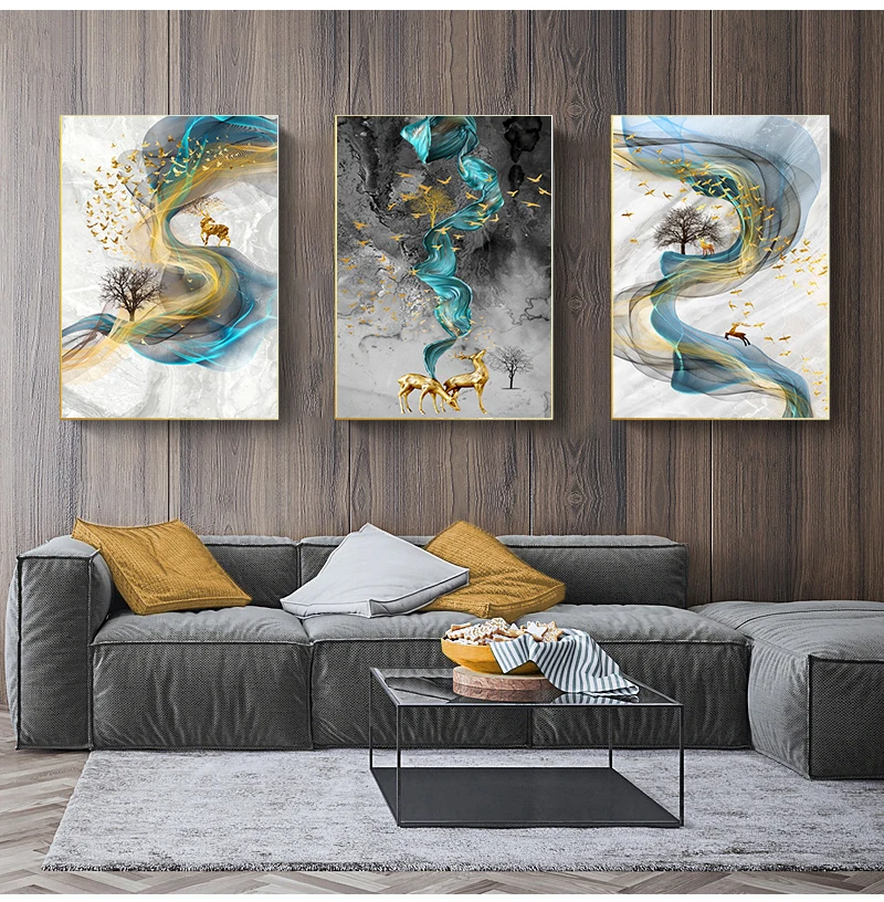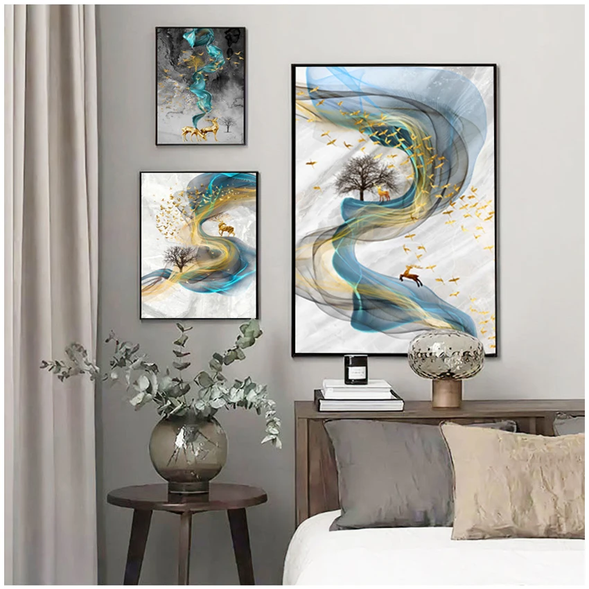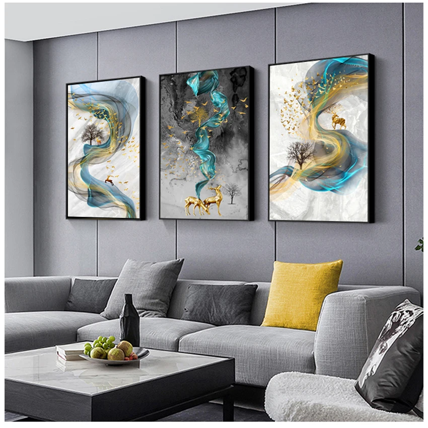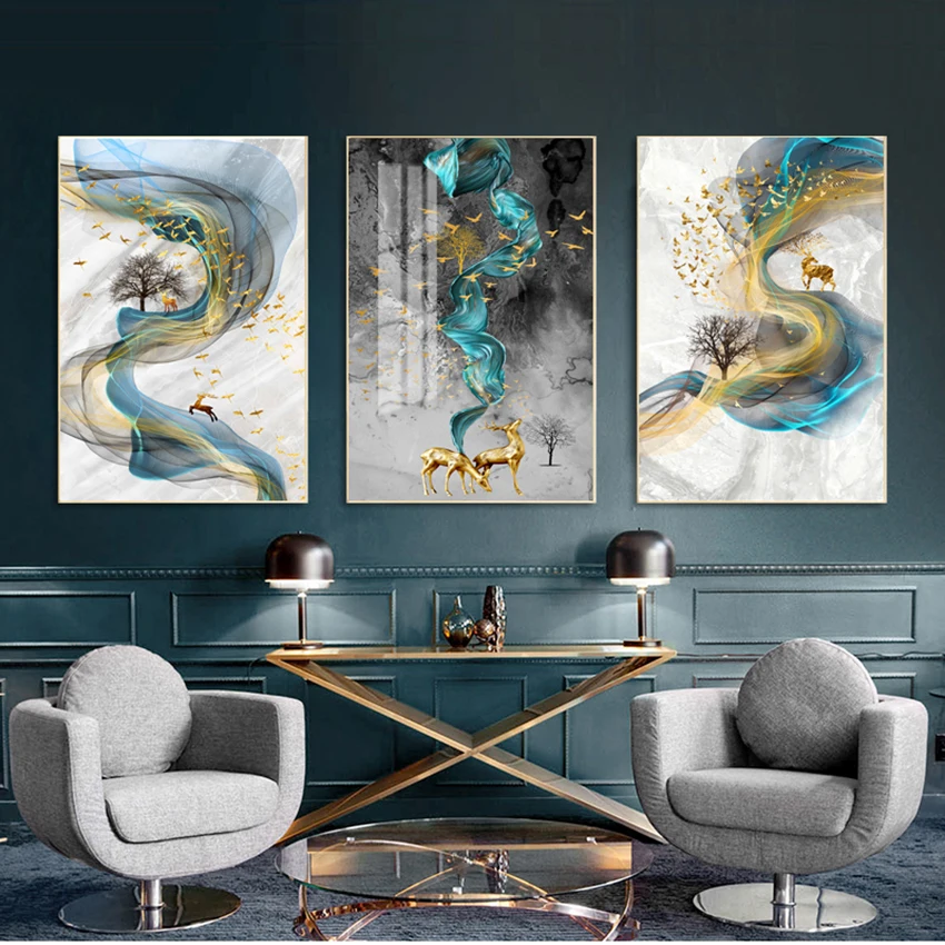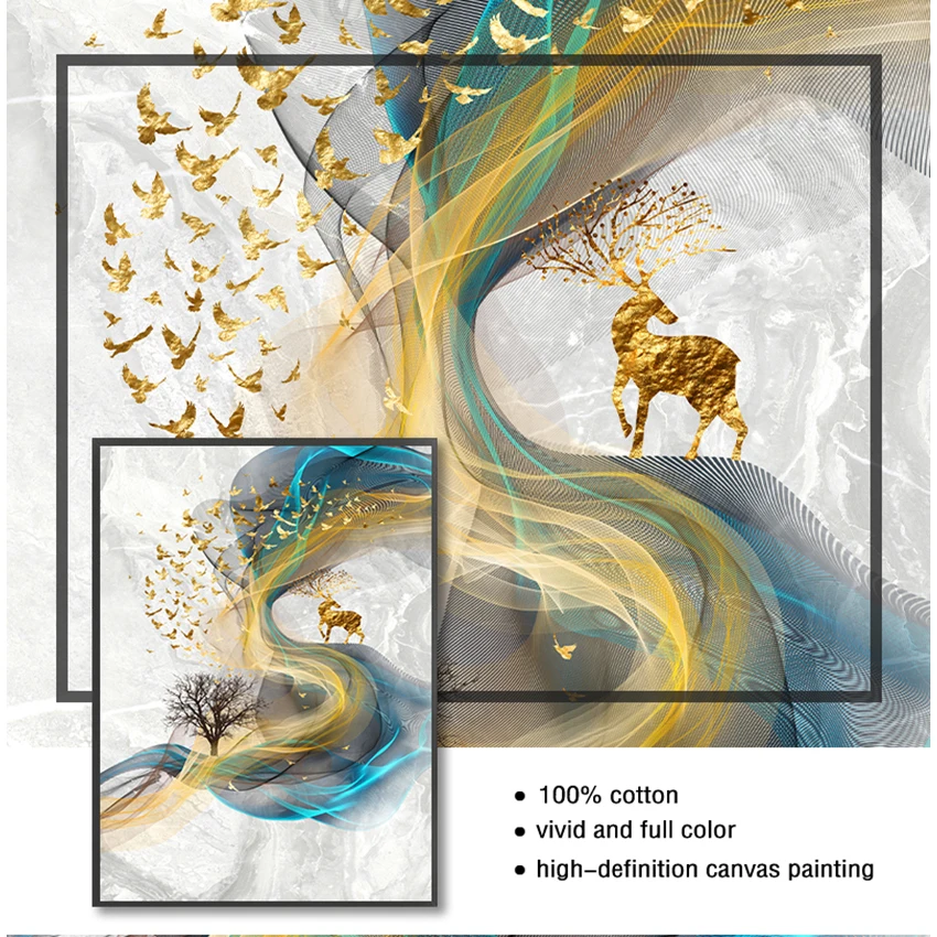 Картина для гостиной Куадрос холст искусство абстрактный Золотой олень живопись Большой размер постер синяя печать Золотая настенная живопись