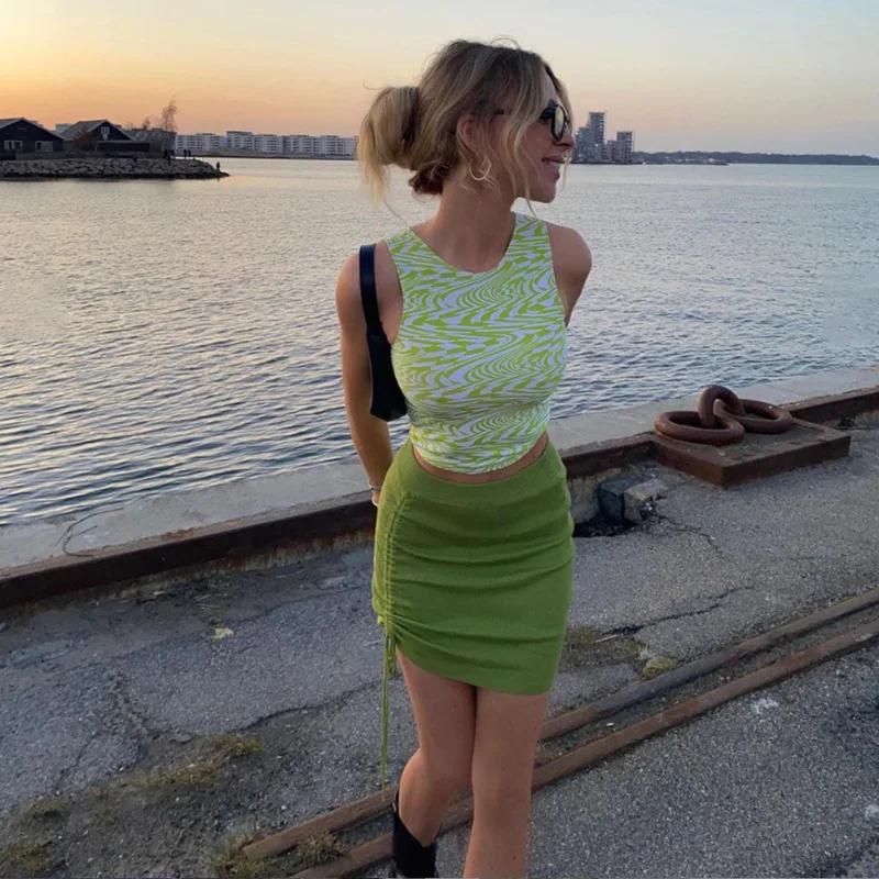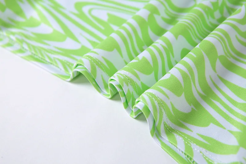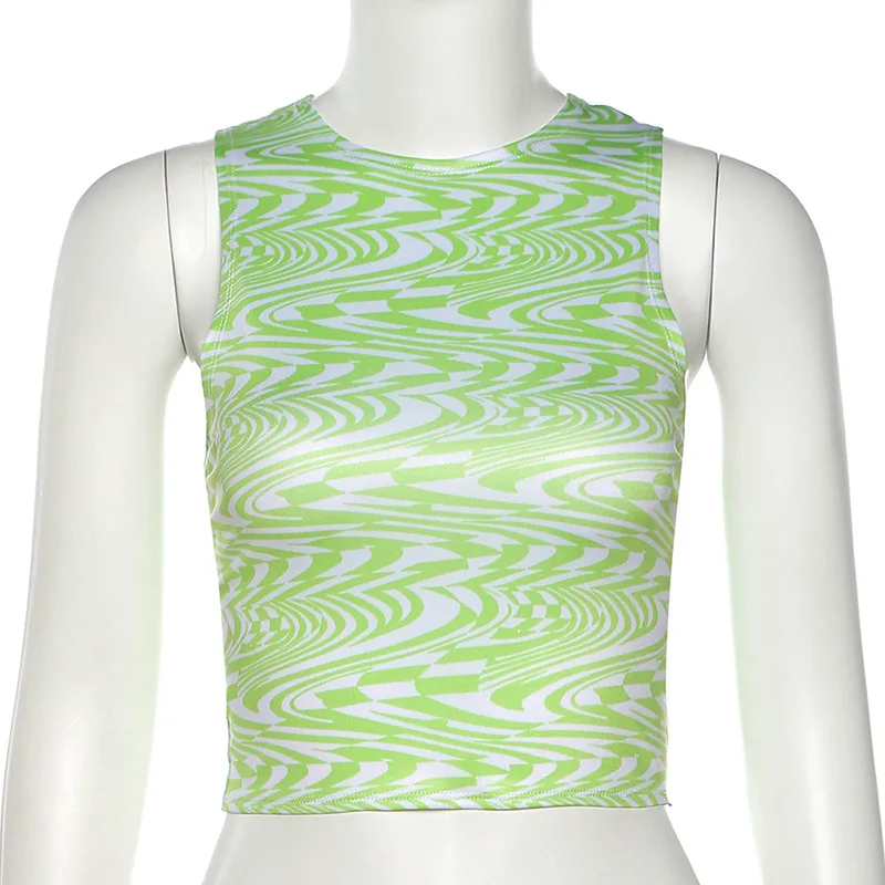 Лето 2021, пикантные облегающие футболки для малышей Yk2, Женский Топ без рукавов, топы, укороченный топ с зеленым волнистым узором, Женский Топ, оптовая продажа