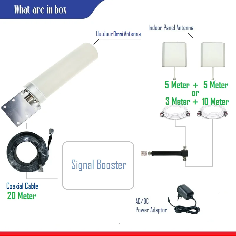 23 м OMNI 2 панели1-бустер 1 шт.2-наружная всенаправленная антенна 1 шт3-Крытый Панель антенна комплект из 2 предметов4- 10 м кабель 2 шт + 3 М кабель 1 шт5- 1 в 2 out без потери сплиттер 1 шт6- NM-NM Соединительный мост без потери 1 шт.