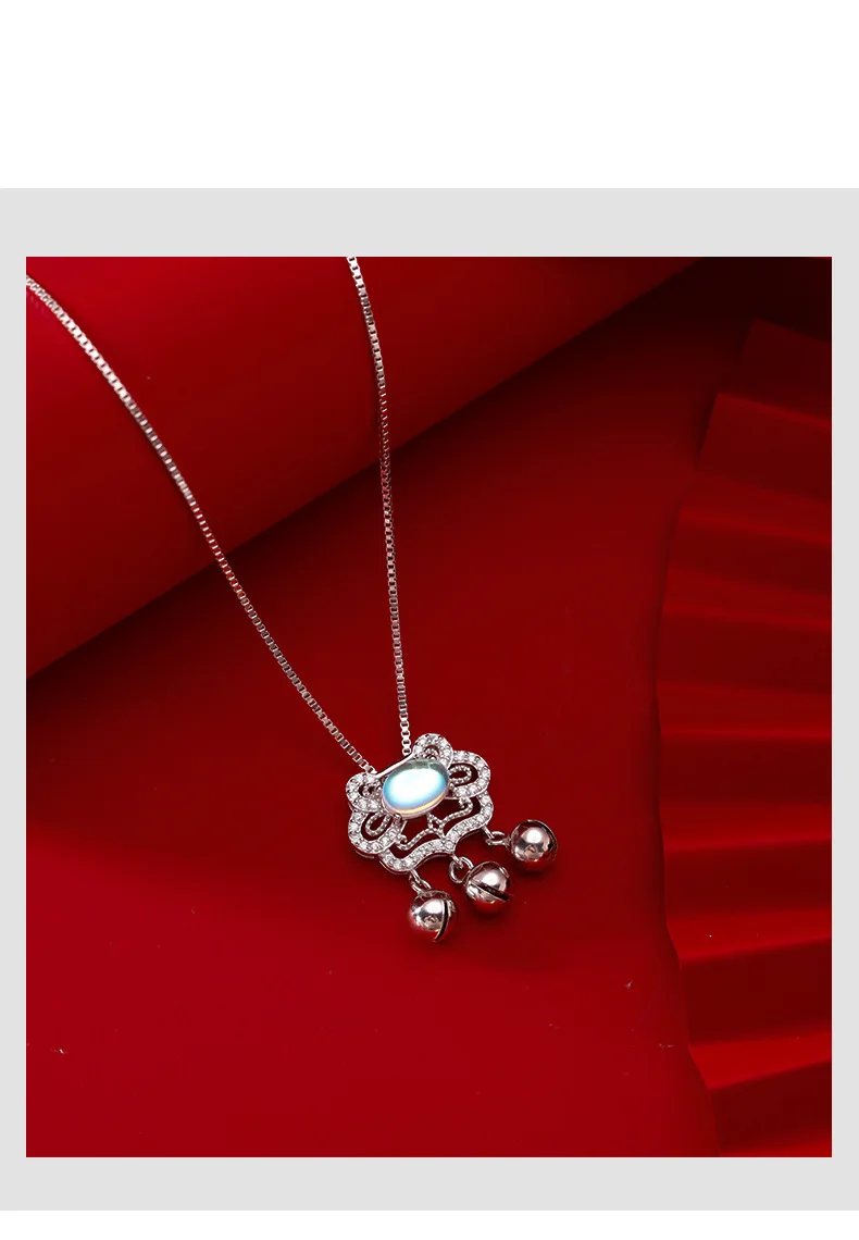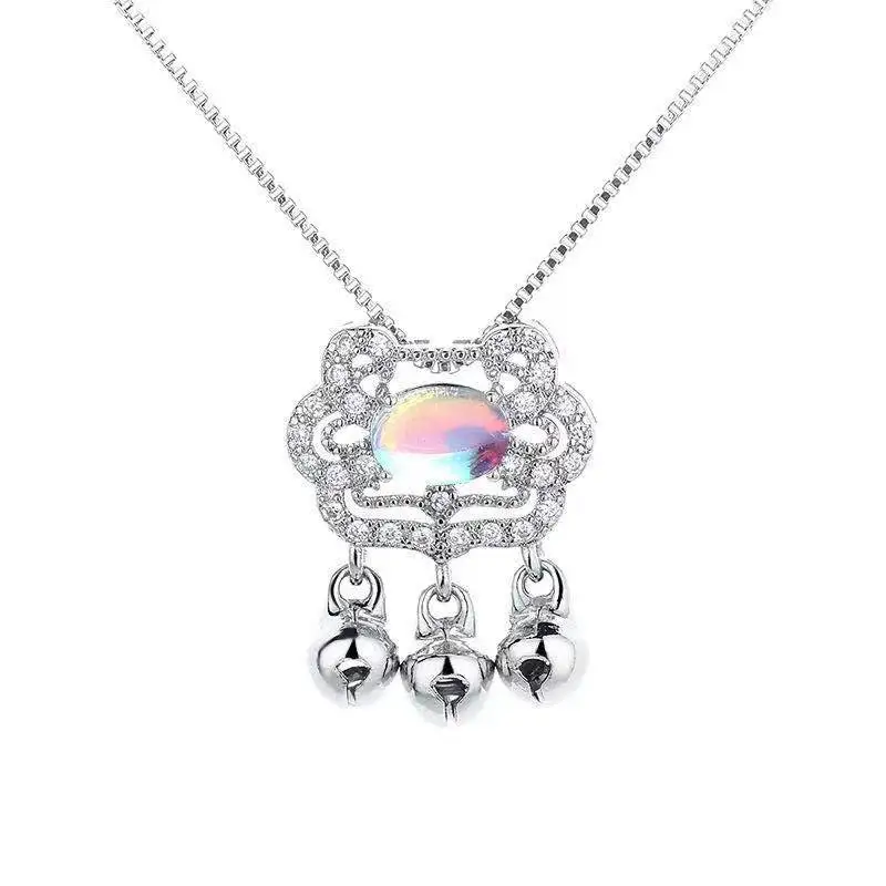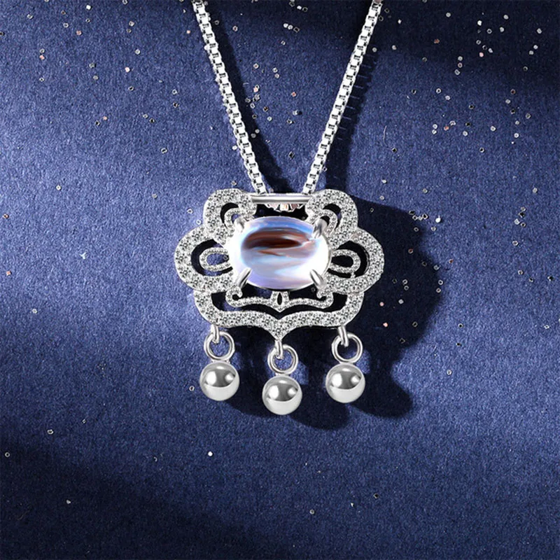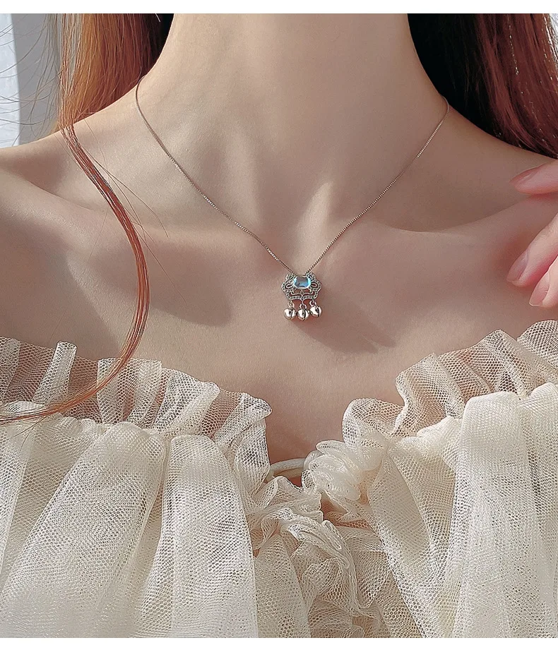 Женские небесно-голубой лунный камень долгий срок службы замок Ping Ruyi цепочка ожерелье маленький колокольчик с бахромой костюм в китайском стиле, серебряные ювелирные изделия ожерелья