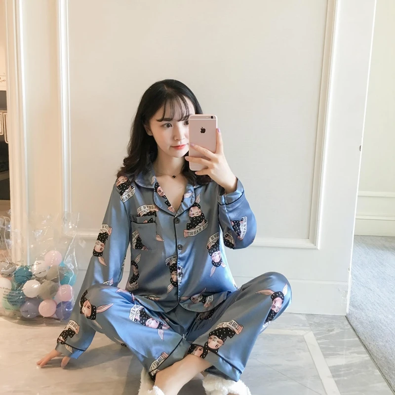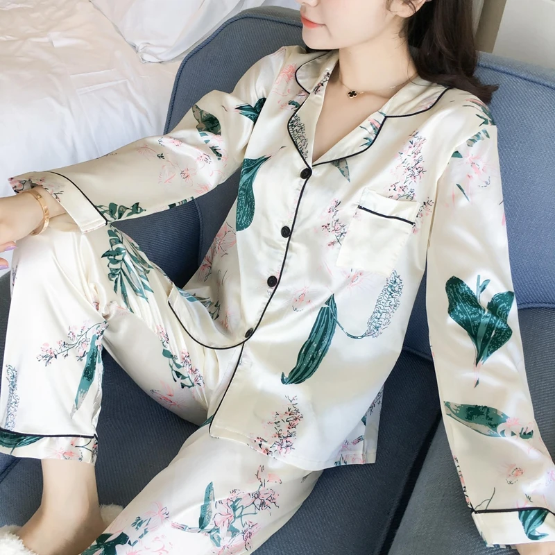 Женская шелковая атласная пижама, пижамный комплект с длинным рукав...