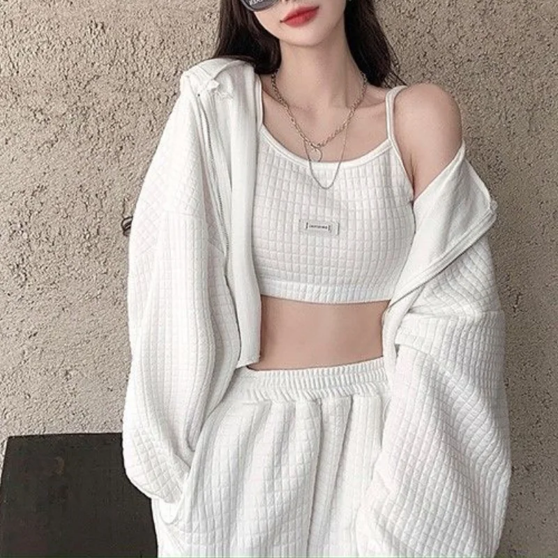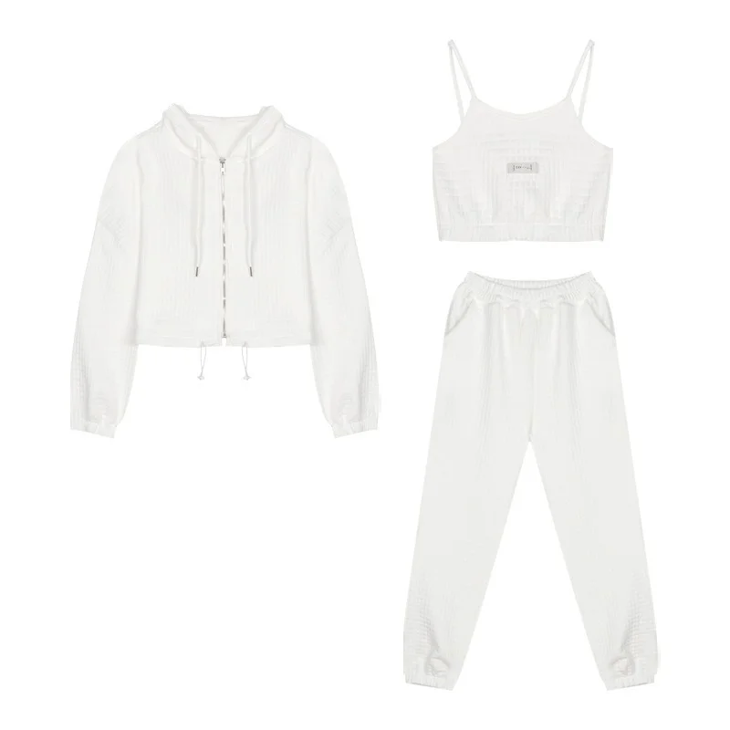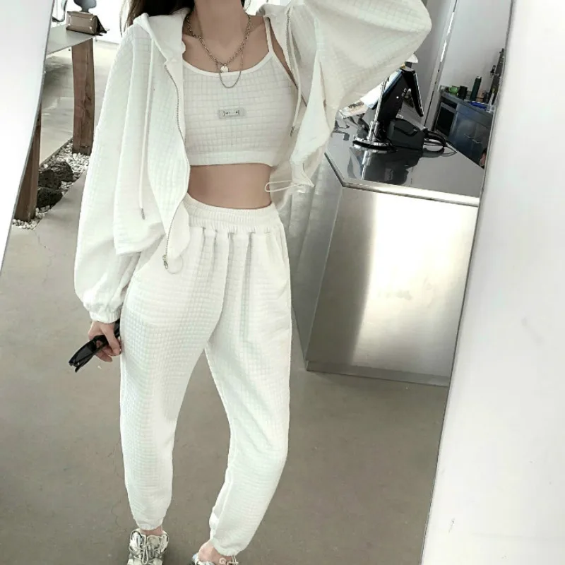 Женский весенний комплект из 3 предметов на молнии, куртка с длинным рукавом и капюшоном, свитшот, майка без рукавов и длинные брюки, осенние модные однотонные свободные костюмы