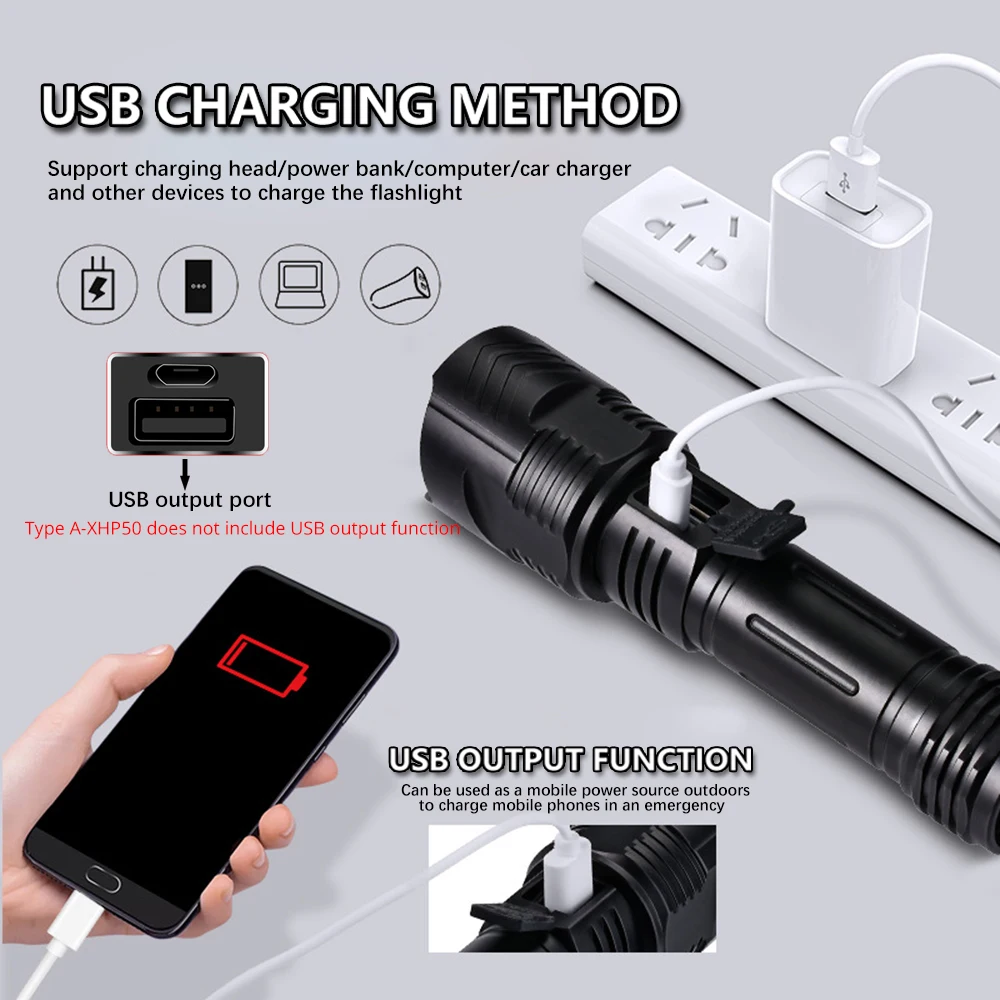 2. Фонарик TypeA-XHP50 не имеет функции выхода USB и не может заряжать мобильные устройства. Два других имеют функцию выхода USB