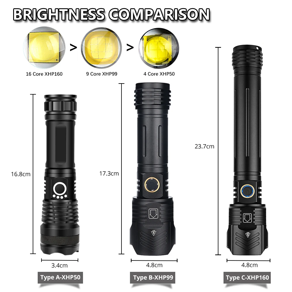 3. Тип A-XHP50 и тип B-XHP99 использует одну батарею 18650 или 26650, а фонарик типа C-XHP160 использует две батареи 18650 или 26650
