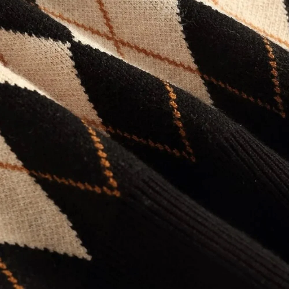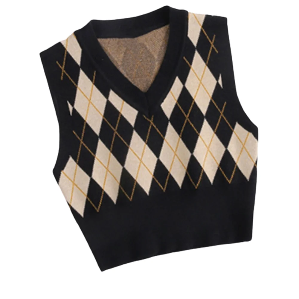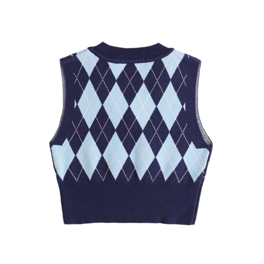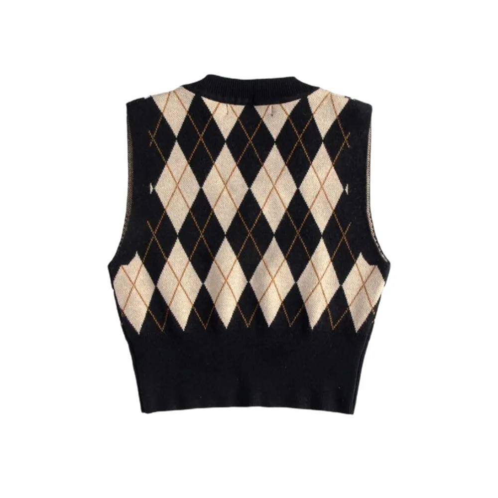 Женский свитер с рисунком ромбиками, универсальный трикотажный контрастный Короткий Джемпер с V-образным вырезом, узкие Джемперы без рукавов, трикотажные топы с V-образным вырезом