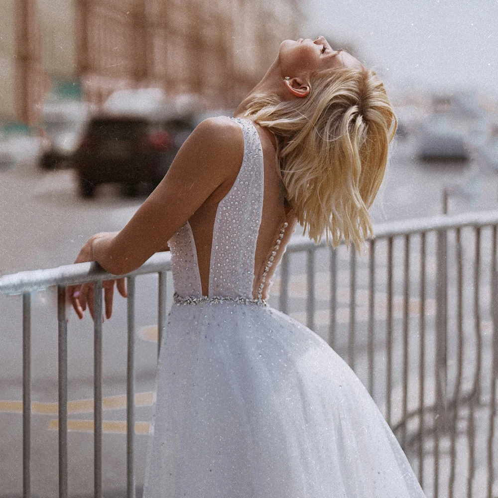 UZN цвета слоновой кости трапециевидной формы с блестками свадебное платье из фатина сексуальный v-образный вырез Бисер пояс для свадебного платья с низким вырезом на спине для невест платья Vestido De Novia