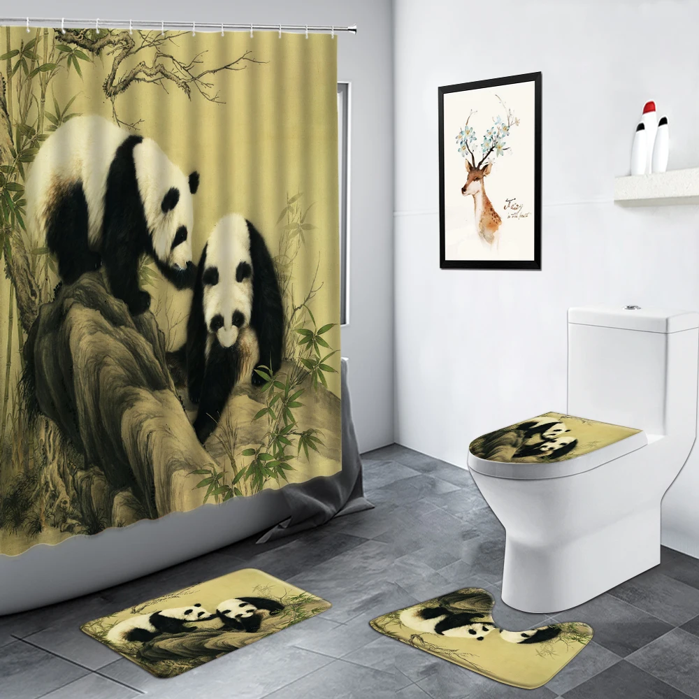 Набор штор для душа в виде милой панды, забавные черные, белые, зеленые, бамбуковые, в китайском стиле, Нескользящие коврики для ванной, коврики для туалета