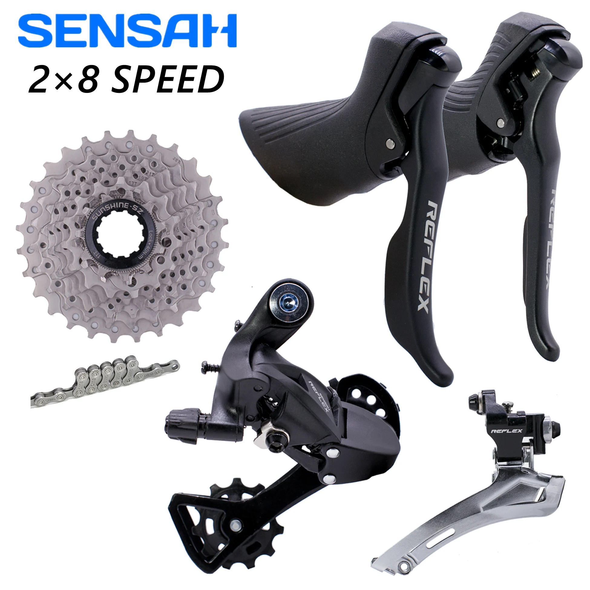 Полный комплект включает в себя: 16sРефлекторный набор SENSAHSENSAH REFLEX 2x8 скоростьРефлекторный Левый переключательРефлекторный правый переключательРефлекторный передний переключательРефлекторный задний переключательЦепь 8s8s 11-28T кассетыТормоз ONIRII BR-002Передний циферблат + задний циферблат 322gПерестановка: 477 граммов