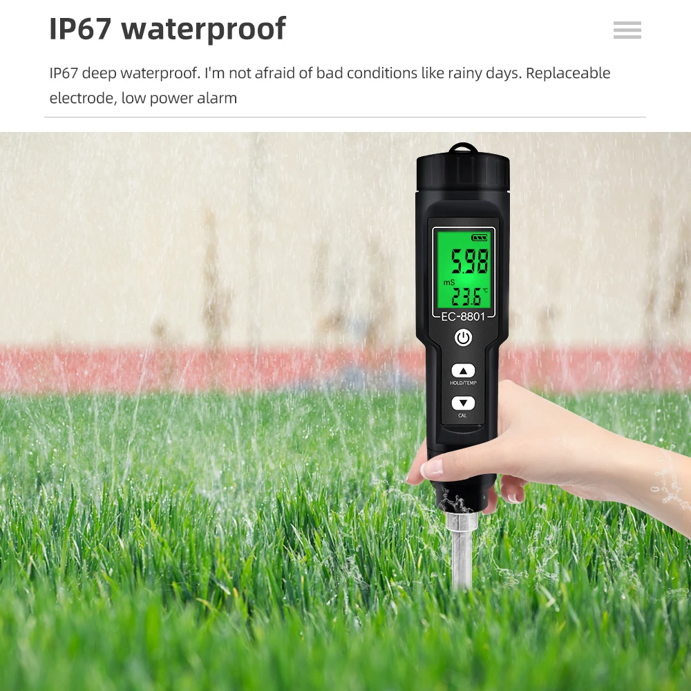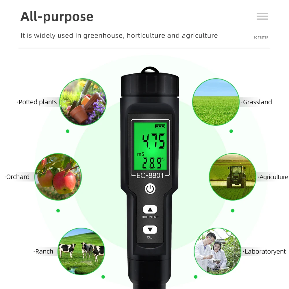 EC-8801/EC-8801A/EC-8801B/EC-8801BB почвы EC Тестер, CE сертификация, качество гарантировано. Большой ЖК-дисплей, подключи и работай, четкие и быстрые данные измерений. Автоматическая компенсация температуры, точные данные, измеряемый EC (0,00-10,00 мс/см), широко используется в теплице посадки, садоводство высадка, посадки сельскохозяйственных угодий, лаборатории, сельского хозяйства, посадки Горшков и т. Д.