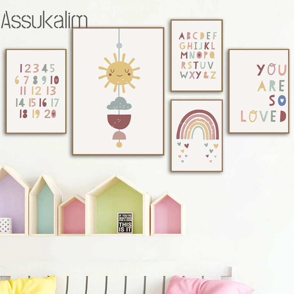 Настенные плакаты для детской комнаты, картины с алфавитом, солнце,...