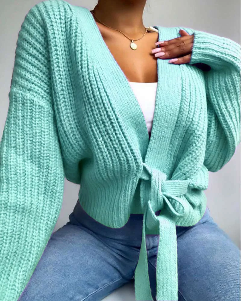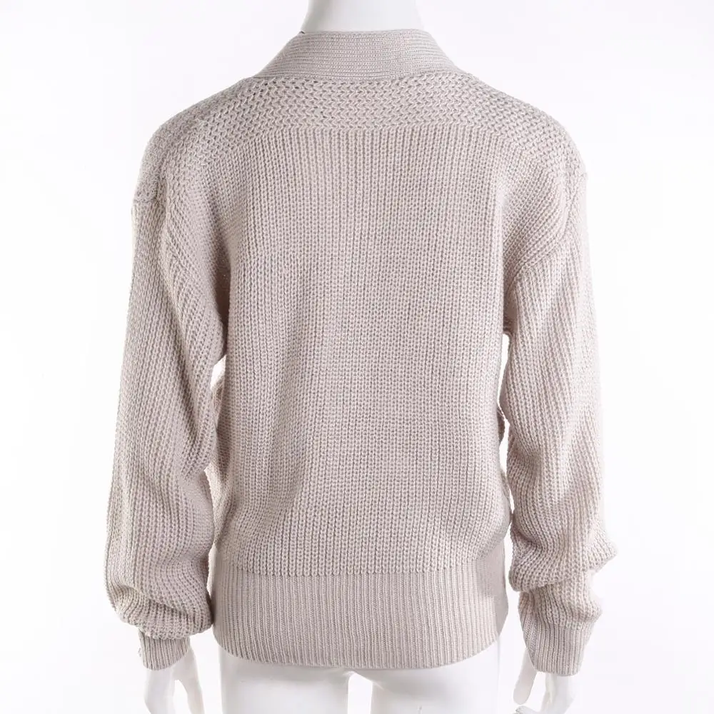Женский однотонный кардиган, вязаный джемпер с V-образным вырезом и рукавами-фонариками