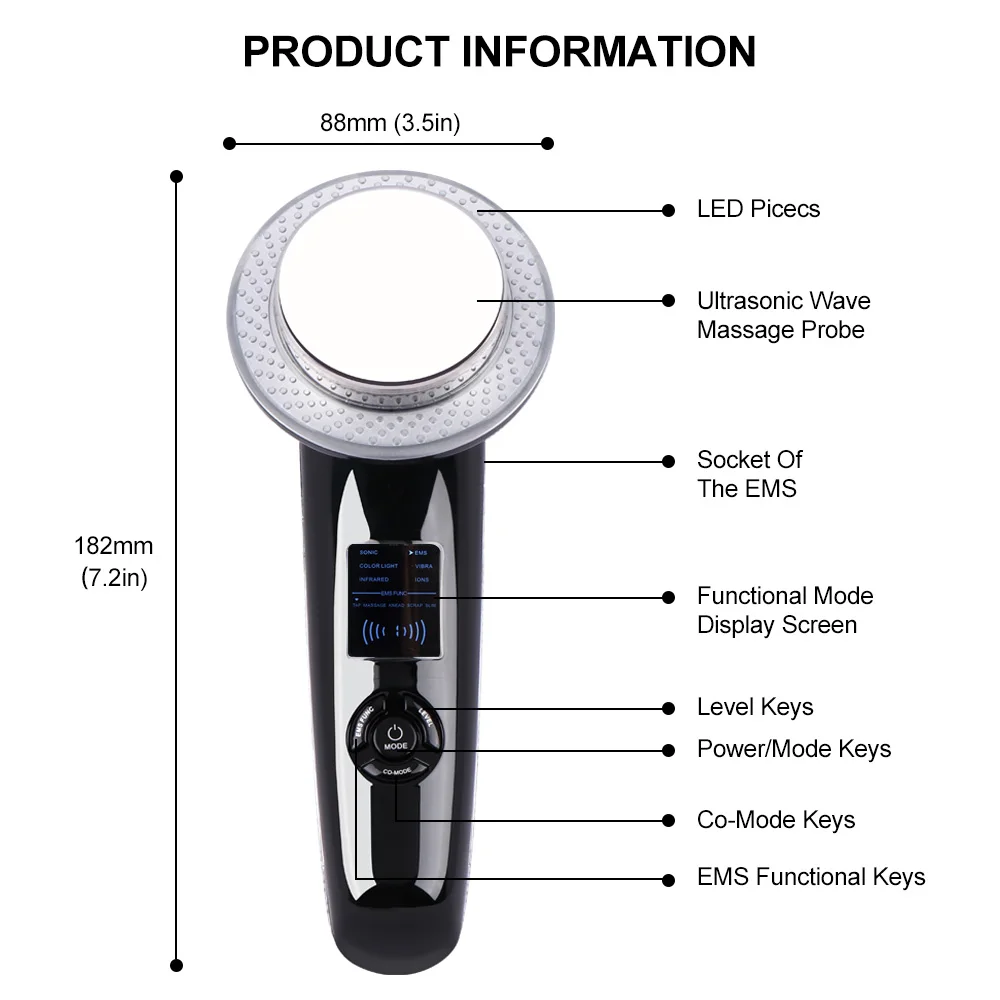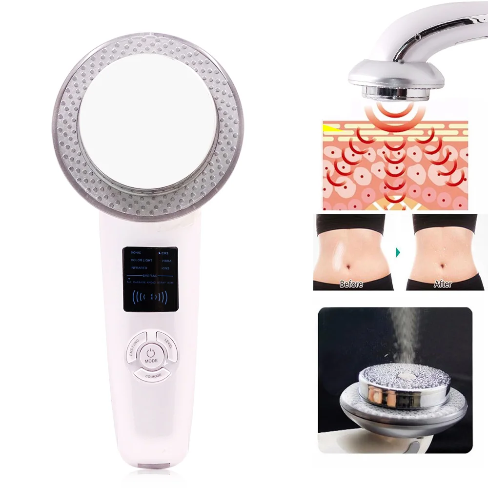 5. Это устройство принимает ультразвук 1 МГц и инфракрасную энергию для массажа и эффективного лечения кожи, а также для выполнения ультразвукового массажа для похудения, чтобы лепить контур тела, устранять лишний жир, тонизировать мышцы, стимулирует здоровую функцию тела через омоложение клеток и восстановление метаболизма тела.