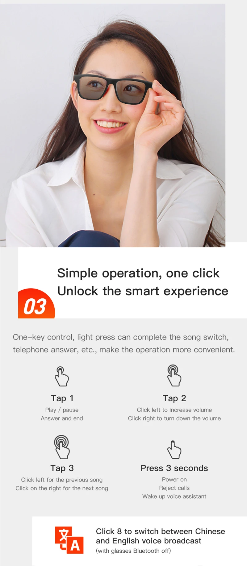 Умные солнцезащитные очки E10-отличный компаньон для вашей повседневной жизни. Это идеальное сочетание BT музыки и УФ-защиты солнцезащитных очков. Вы будете иметь четкое видение независимо от того, какая ситуация. Более того, вы можете наслаждаться свободой беспроводной музыки и громкой связи. Подходит для активного отдыха, таких как Велоспорт, рыбалка, путешествия, альпинизм, гольф и т. д.