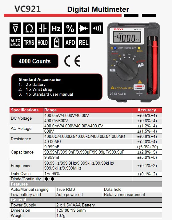 ZOYI VC921 карман Стиль Цифровой мультиметр 4000 отсчетов T-среднеквадратичный Тестер Вольтметр Батарея тестер
