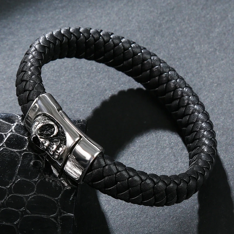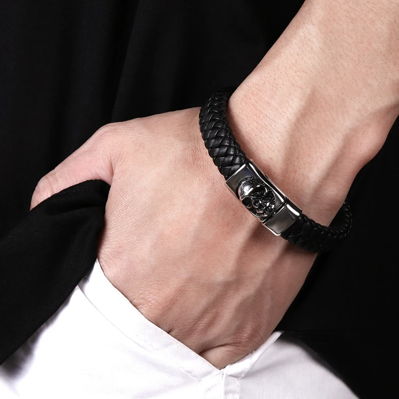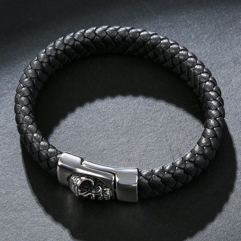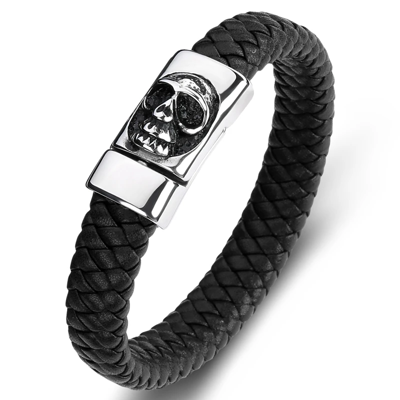 Плетеный кожаный браслет ручной работы, мужской браслет из нержавеющей стали в стиле панк-рок, с черепом, P097