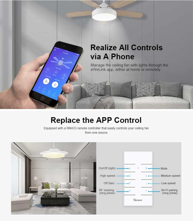 SONOFF iFan03 поставляется с дистанционным управлением 433 RF, с которым вы можете включить/выключить вентилятор и светильник, регулировать скорость вентилятора в помещении.