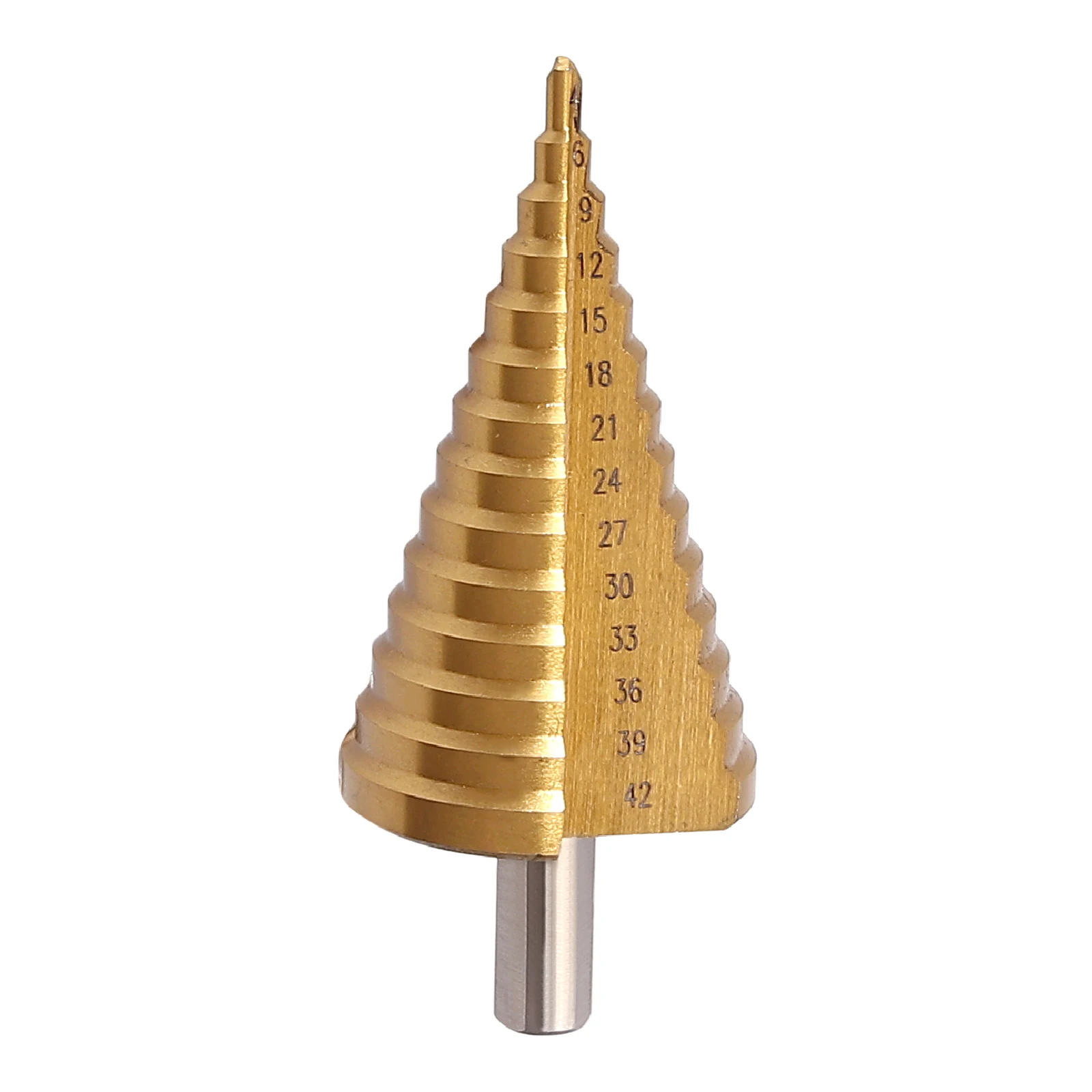4 - 42 мм ступенчатое сверло из быстрорежущей стали, титановое Коническое отверстие, инструмент для резки металлаХарактеристика:* 100% новый и высокое качество* Уникальная структура лестницы, она может открыть несколько диафрагм* Он может вытягивать, фаски и открывать отверстие, но обычный Бур не может* Маленький камень, он может выгравировать красивую диафрагму, не используя сначала центральный удар* Вода делает его прохладным во время работы, она может эффективно продлить срок службы* Снятие заусенцев, снятие фаски, эллиптическая дыра, сверла, настольные дрели* Широко используется для вырезания отверстий из различных материалов, таких как сталь, дерево, тонкое железо, алюминиевый сплав, изоляционные доски, ПВХ лист и т. Д.* Рекомендуемая скорость бурения 250 -- 400 об/мин* Подходит для использования в твердости под 25 ° артефакты, толщина пластины до 5 мм* Только ступенчатое сверло, другие аксессуары на фото не включеныХарактеристики:* Материал: HSS4241* Размер: app.10x98мм/0.39x3.86in* Стиль: 4-42 мм (4, 6, 9, 12, 15, 18, 21, 24, 27, 30, 33, 36, 39, 42 мм)* Цвет: Золотой* Количество: 1 шт.Посылка включает:1 ступенчатое сверло
