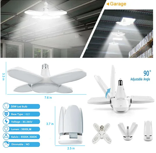 -Регулируемый панели: светодиодный гараж светильник разработан с четырьмя регулируемый светодиодный крылья, который может быть сложен до 90 градусов, а также имеется круговой направленный вниз светильник так, как вам нравится. Возможность сгибать дужки лампы, чтобы затопить более темные зоны комнаты, светильник очень полезен, приносим огромное количество светильник.