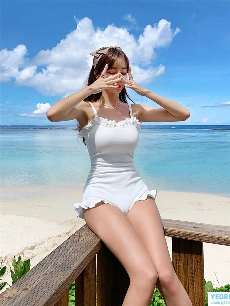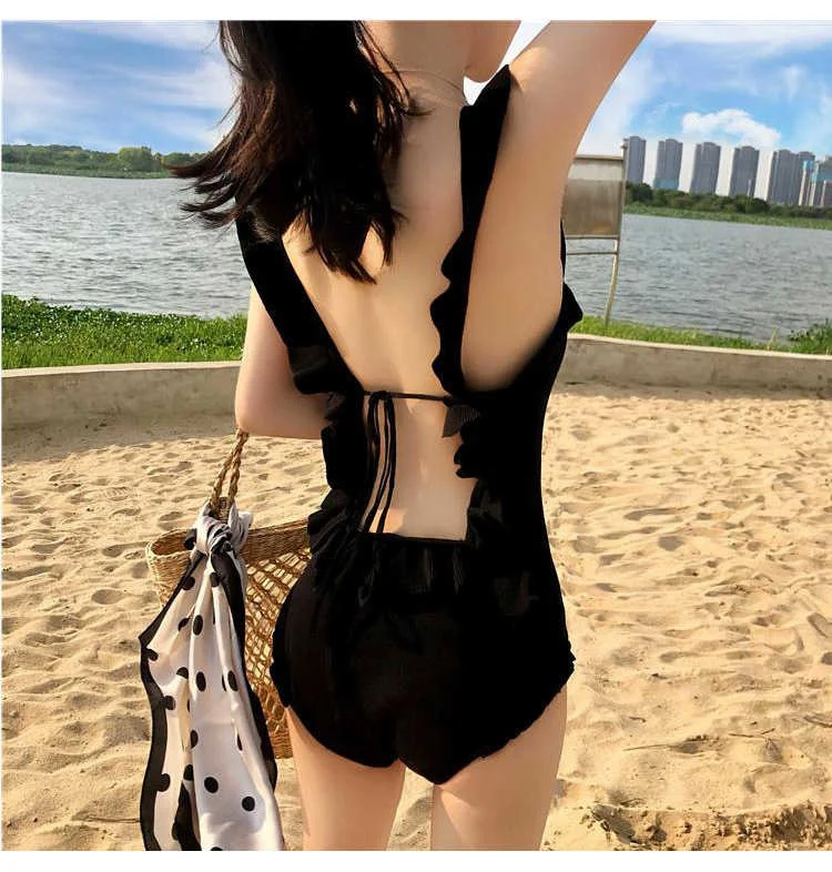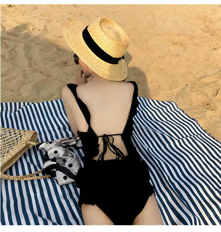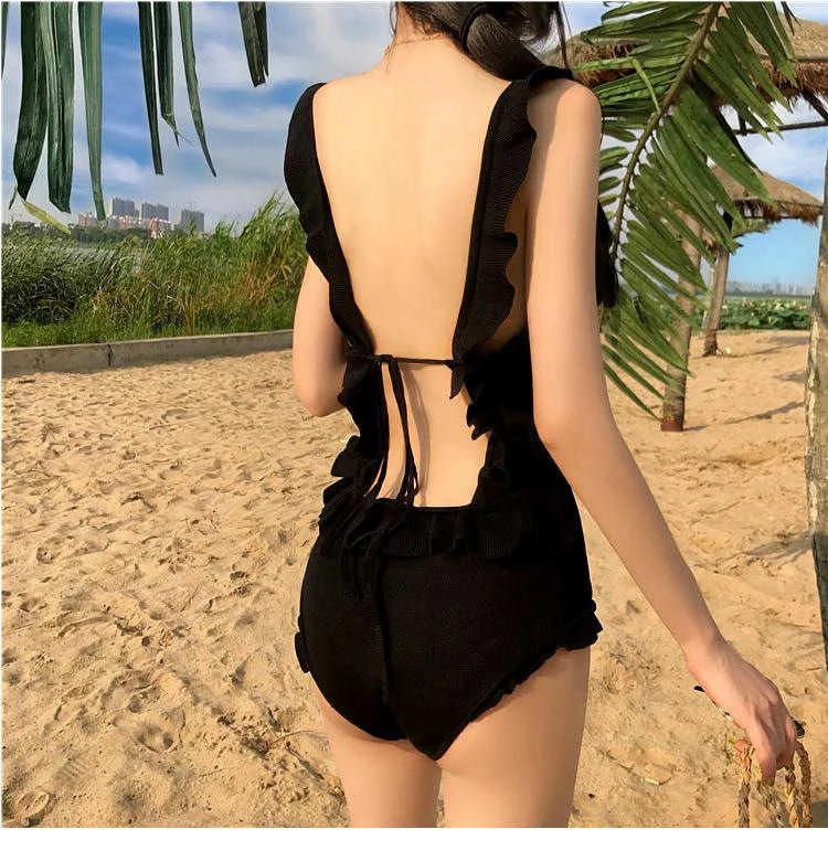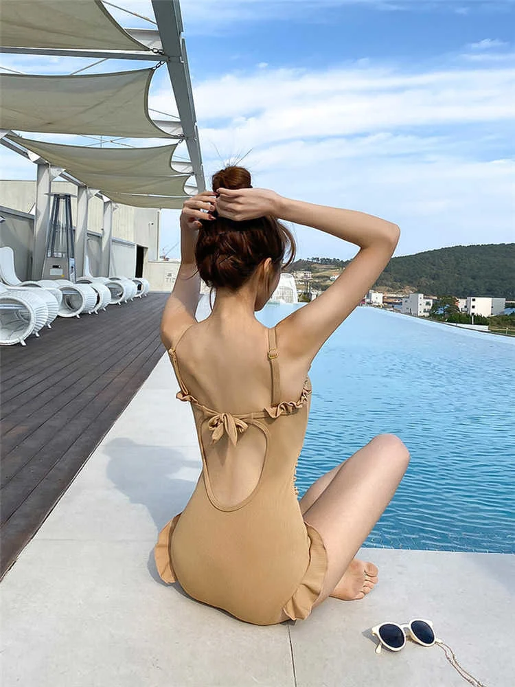 Летний однотонный кружевной соблазнительный купальник с лямкой на шее, прикрывающий живот и привлекательный тонкий женский купальник
