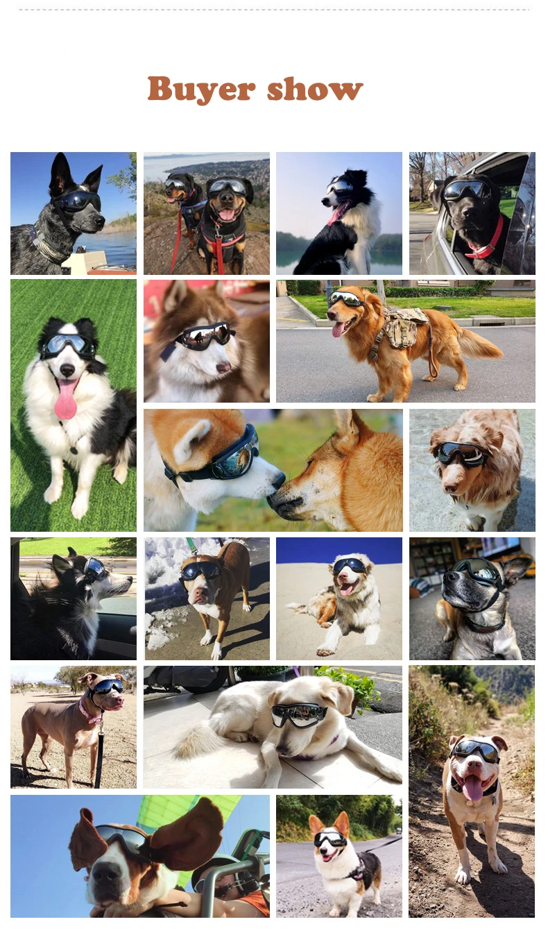 100% новый и высококачественныйФункция:Небьющиеся и противотуманныеЗащищает глаза вашей собаки от ультрафиолета, ветра, воды, мусора и лягушки100% УФ-защитаПенопластовая рамкаРегулируемый двойной ремешок для плотного прилеганияРекомендуется ветеринарЗабавный, но функциональный дизайн-полная защита от ультрафиолета, ветра, воды и мусораБолее широкая переносица, более глубокая линза и более прочная оправа, чем у других брендовПодходит: регулируемый задний ремешок 28-48 см, регулируемый ремешок для подбородка 17-25 смЦвет: черныйРазмер: регулируемые ремни для головы и подбородка, подходят для крупных собак.Комплектация:1 Солнцезащитные очки Pet очки для собаки