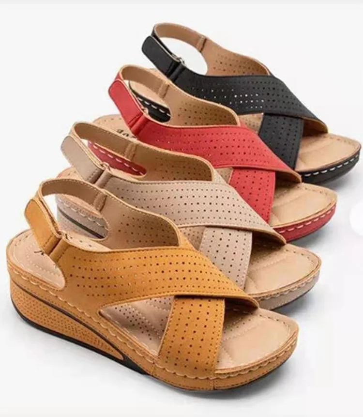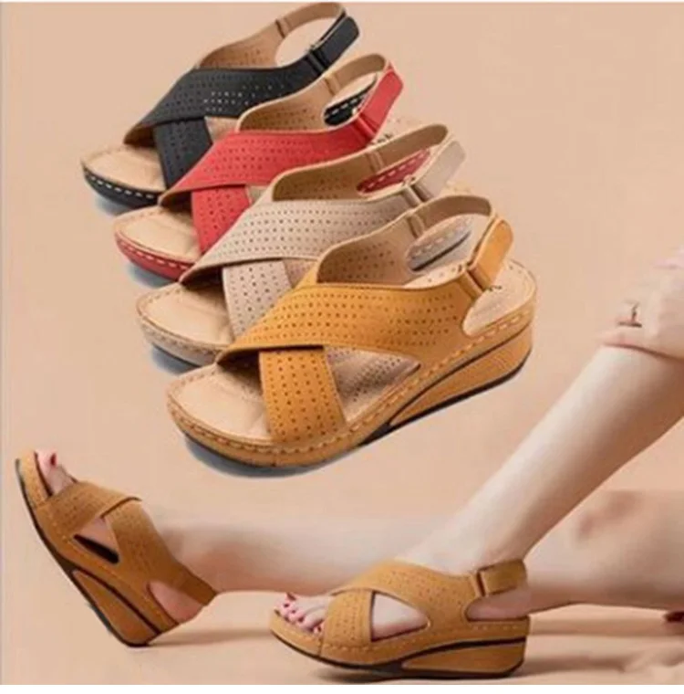 Женская обувь; Летние повседневные женские босоножки на толстой танкетке; Женские босоножки красного цвета с вырезами